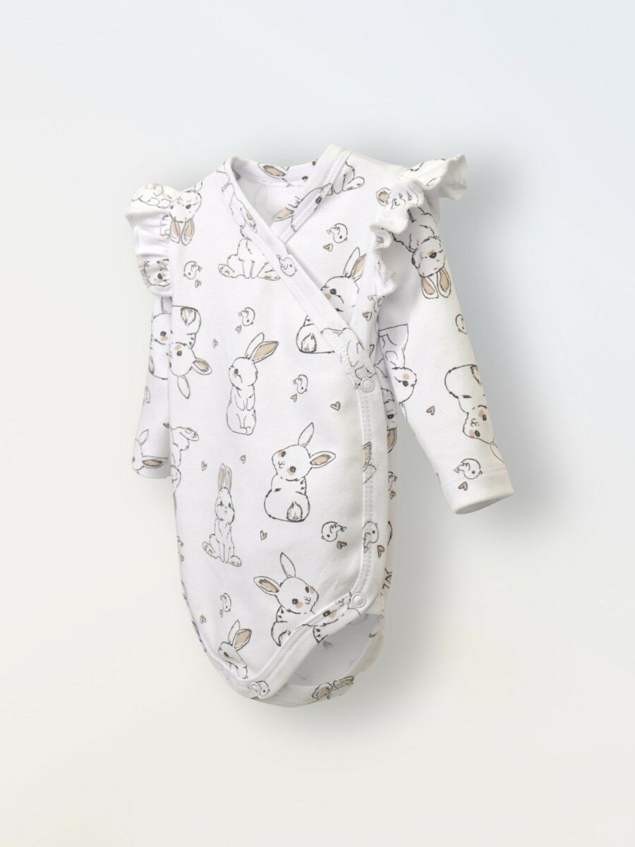 Боди кимоно Bebo, с рюшами с длинным рукавом на кнопках с антицарапками, Зайчики в цветах, размер 68 см