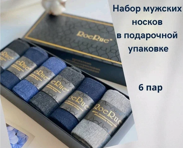 Носки унисекс RoeRue, 6 пар, классические, подарочная упаковка, быстросохнущие, нескользящие, ароматизированные, на 23 февраля, антибактериальные свойства, размер 41-47, синий, серый