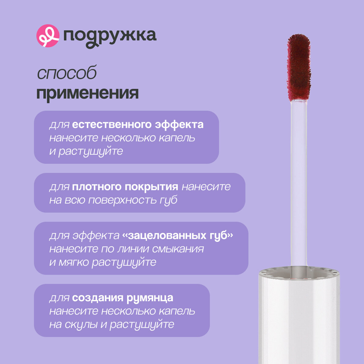 | Способ применения | 1. Для естественного эффекта точечно нанесите несколько капель тинта на губы с помощью аппликатора и незамедлительно растушуйте подушечками пальцев вбивающими движениями либо небольшой кистью. Наслаивайте для получения более глубокого и насыщенного оттенка, обязательно давая покрытию высохнуть между слоями. 2. Для более плотного покрытия и насыщенного (яркого) оттенка равномерно нанесите тинт аппликатором на всю поверхность губ. 3. Для создания эффекта «зацелованных губ» нанесите тинт по линии смыкания губ и мягко растушуйте по направлению к краям. |