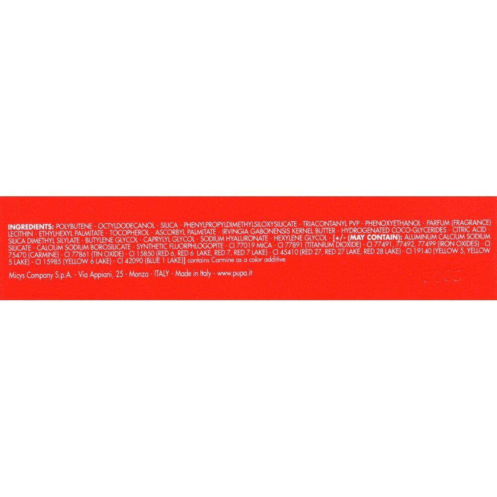 | Состав | polybutene, octyldodecanol, hydrogenated polyisobutene, ethylene, propylene, styrene copolymer, parfum (fragrance), butylene/ethylene/styrene copolymer, tocopheryl acetate, ethylhexyl palmitate, irvingia gabonensis kernel butter, bht, hydrogenated coco-glycerides, silica dimethyl silylate, butylene glycol, caprylyl glycol, phenoxyethanol, sodium hyaluronate, hexylene glycol may contain: aluminum calcium sodium silicate, calcium sodium borosilicate, synthetic fluorphlogopite, ci 77019 mica, ci 77891 (titanium dioxide), ci 77491, 77492, 77499 (iron oxides), ci 75470 (carmine), ci 77861 (tin oxide), ci 15850 (red 6, red 6 lake, red 7, red 7 lake), ci 45410 (red 27, red 27 lake, red 28 lake), ci 19140 (yellow 5, yellow 5 lake), ci 15985 (yellow 6 lake), ci 42090 (blue 1 lake) |