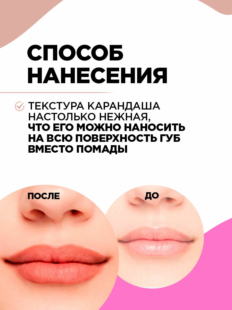 | Способ применения | очертите контур губ и растушуйте линию внутрь, чтобы мягко соединить с помадой или блеском. Или накрасьте карандашом всю поверхность губ |