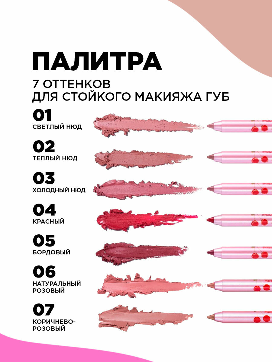 | Цвет товара | 01 светлый нюд, 02 теплый нюд, 03 холодный нюд, 04 красный, 05 бордовый, 06 натуральный розовый, 07 коричнево-розовый, 2, 3 |