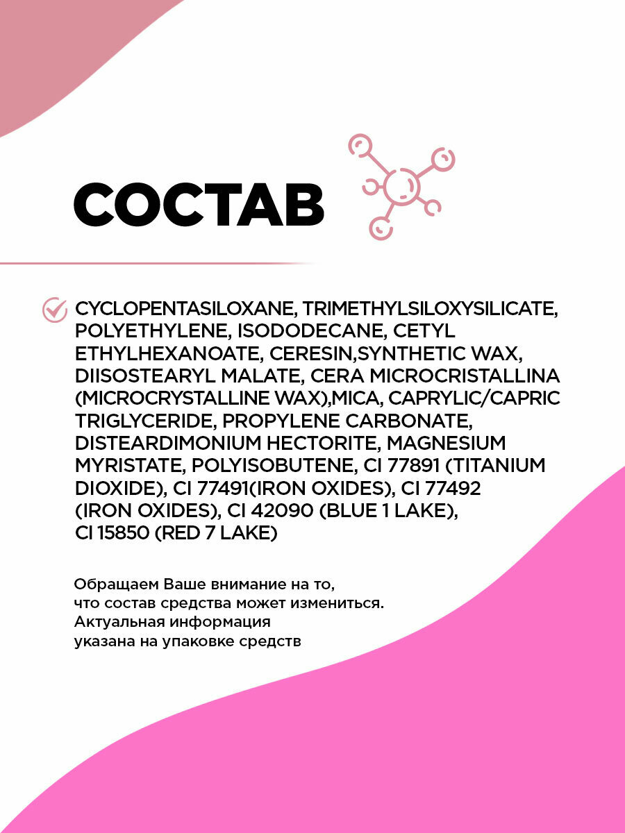 | Цвет товара | 01 светлый нюд, 02 теплый нюд, 03 холодный нюд, 04 красный, 05 бордовый, 06 натуральный розовый, 07 коричнево-розовый, 2, 3 |