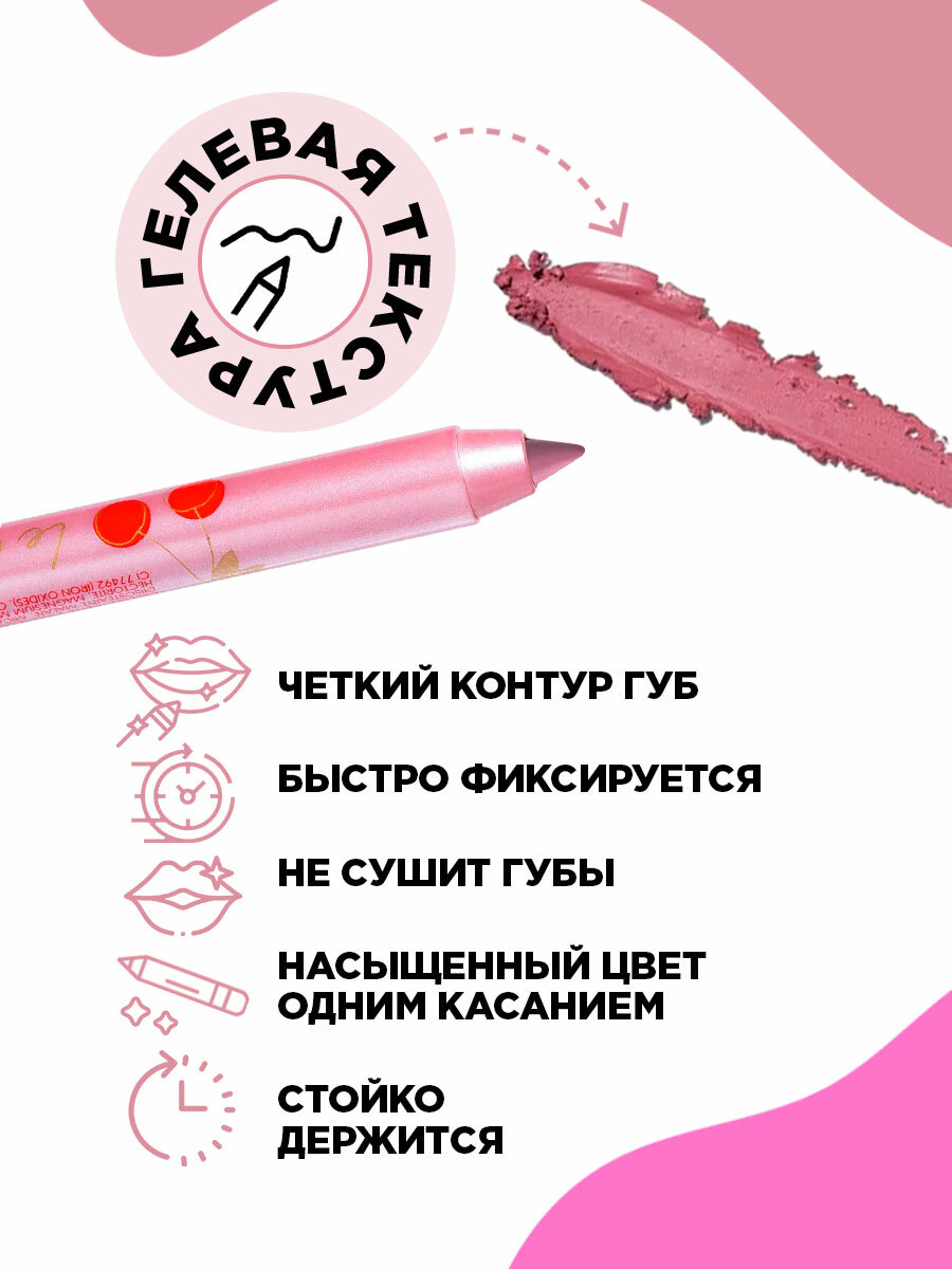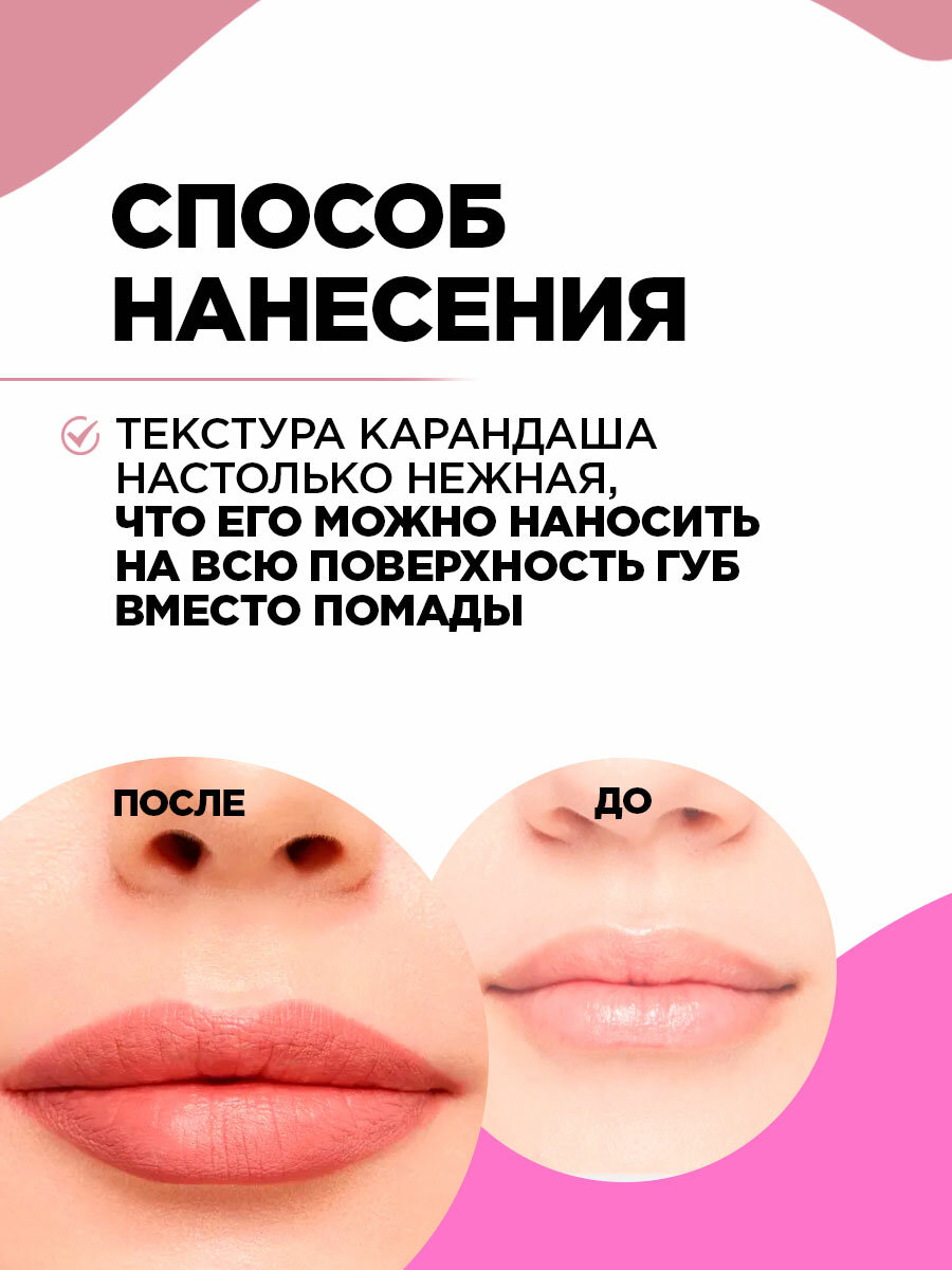 | Способ применения | очертите контур губ и растушуйте линию внутрь, чтобы мягко соединить с помадой или блеском. Или накрасьте карандашом всю поверхность губ |