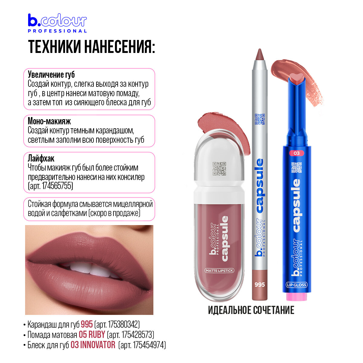 Ниже Вы можете прочитать отзывы на Карандаш для губ матовый стойкий B.COLOUR PROFESSIONAL CAPSULE коричневый нюдовый 995, ознакомится с подробными характеристиками, посмотреть интересные обзоры и фотографии на Карандаш для губ матовый стойкий B.COLOUR PROFESSIONAL CAPSULE коричневый нюдовый 995.