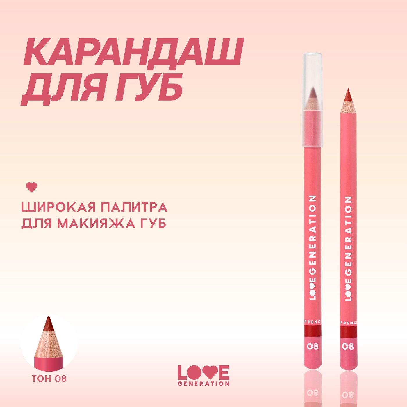 Карандаш для губ Love Generation ровный четкий контур, тон 08, красный, 1,2 г