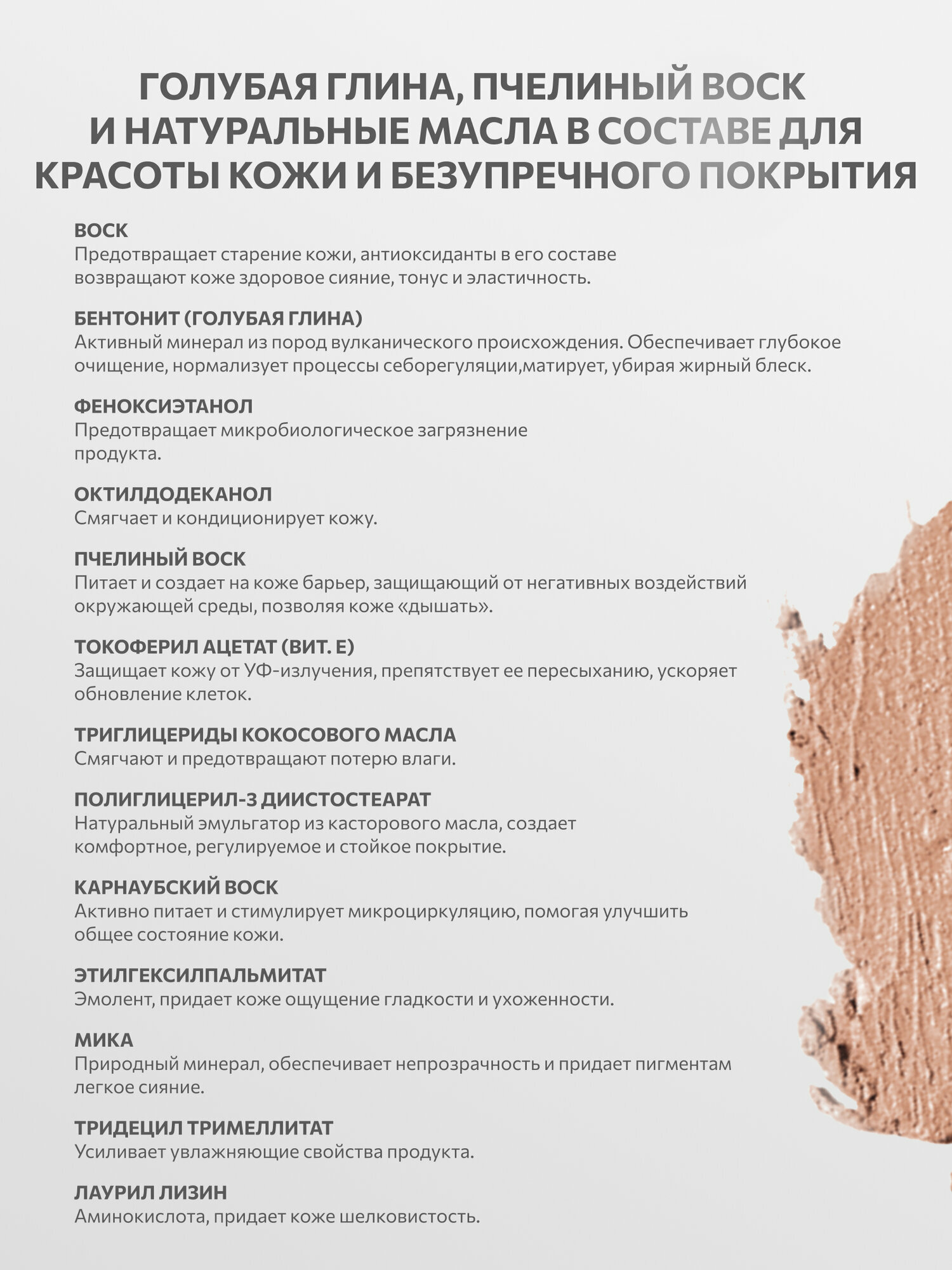| Состав | воск;полиэтилен;бентонит;феноксиэтанол;октилдодеканол;пчелиный воск;токоферил ацетат;каприловый триглицерид;полиглицерил-3 диистостеарат;парфюм;каприлик триглицерид;пропилен карбонат;карнаубский воск;этилгексилпальмитат;мика;тридецил тримеллитат;лаурил лизин |