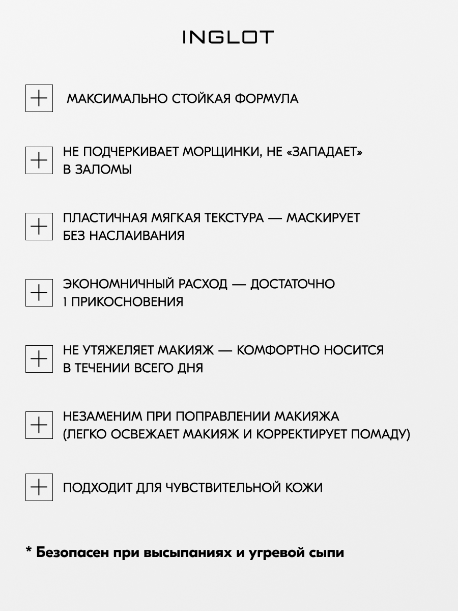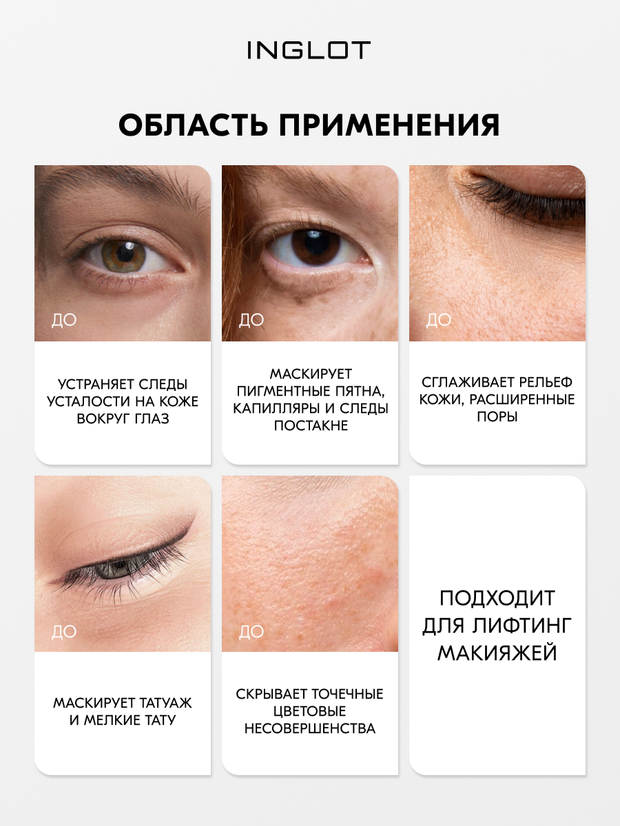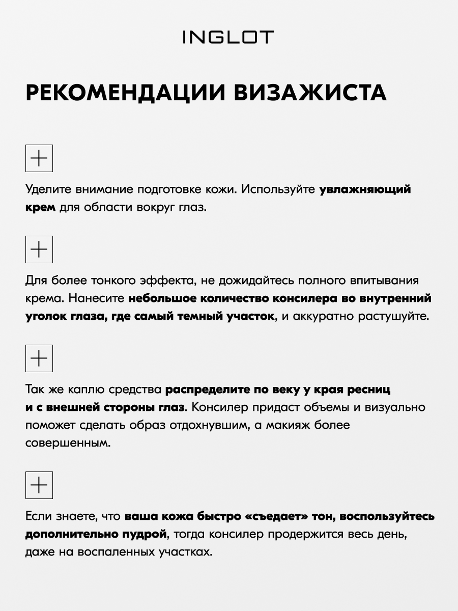 | Способ применения | Консилер является многозадачным продуктом, который может быть инструментом для контуринга, так как имеет сильное покрытие. Идеально подходит для точечного нанесения на любую часть лица. |