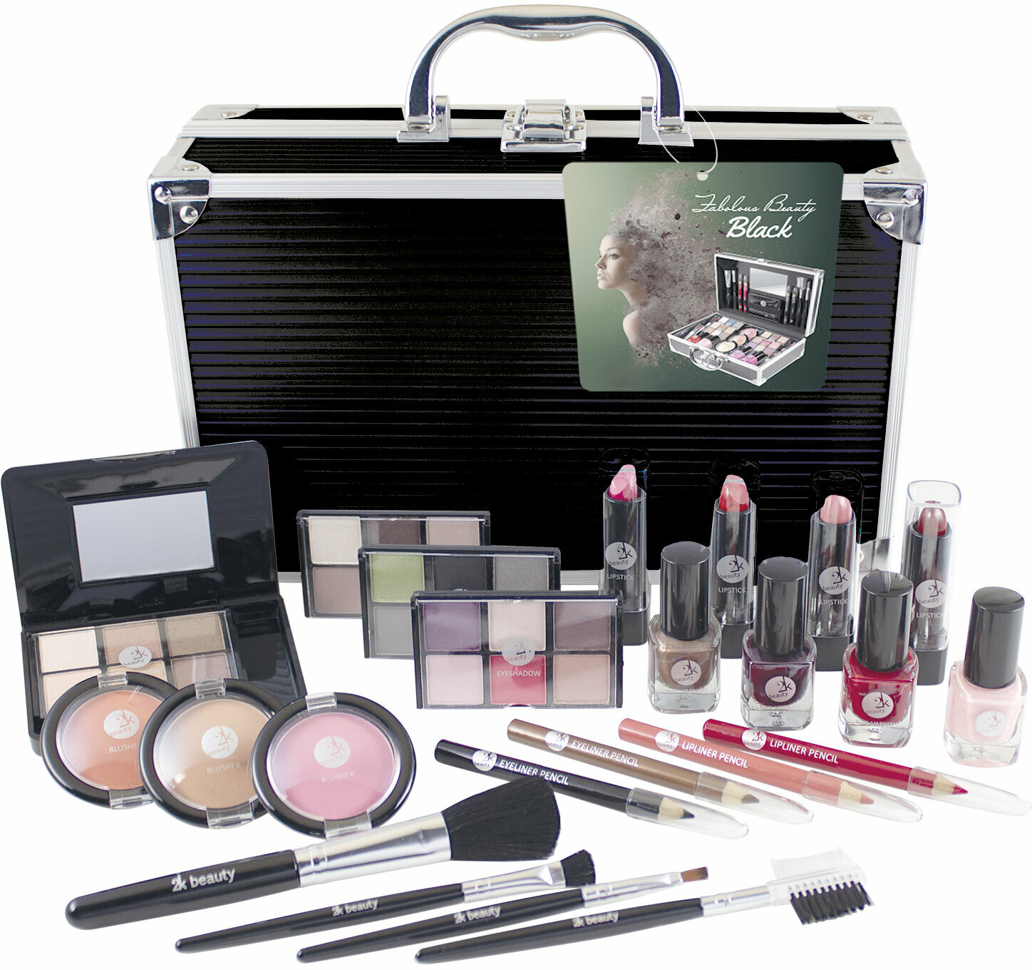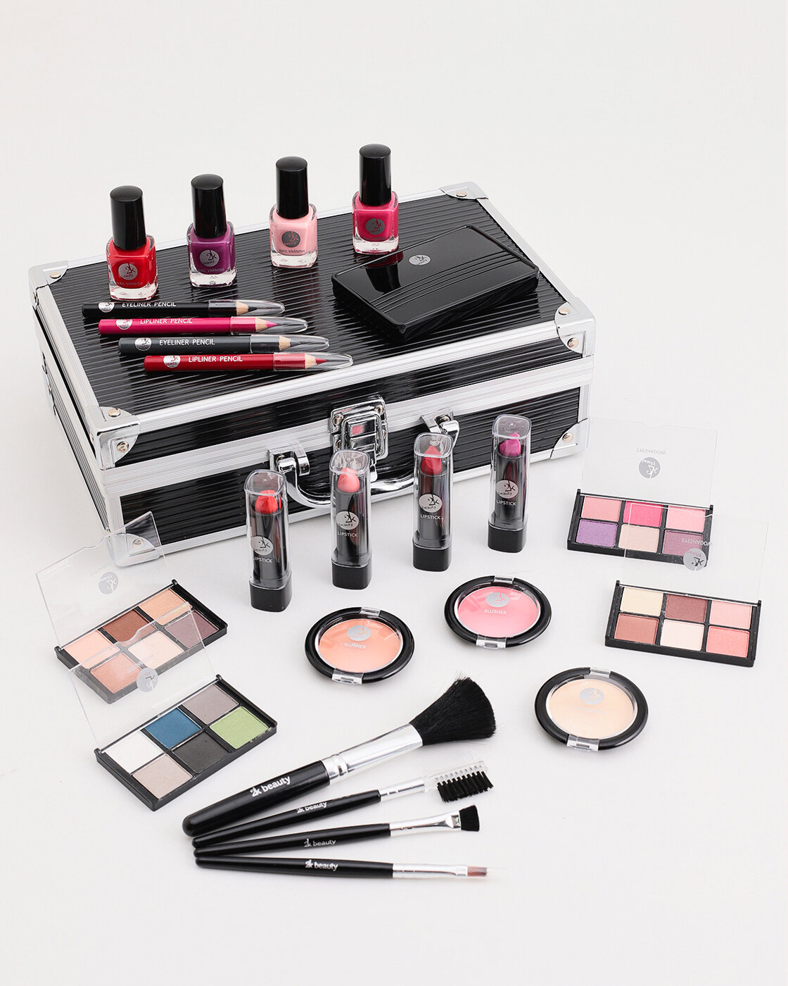 | В наборе | тени для век 24 оттенка, 4 оттенка помады для губ, 2 оттенка румян, хайлайтер, 2 карандаша для губ, 2 карандаша для глаз, лак для ногтей 4 цвета, кисть для румян, кисть для теней, расческа для бровей, кисть для губ, кейс для теней с зеркалом, косметический чемоданчик |