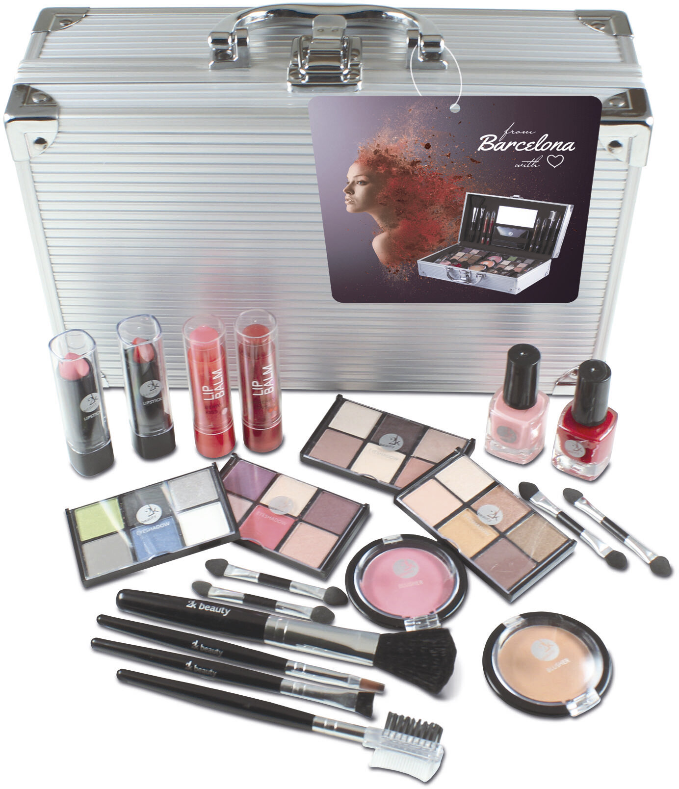 Подарочный набор декоративной косметики для макияжа 2K Beauty в органайзере чемодане / палетки теней для век, румяна, помада, лак для ногтей / бьюти бокс №6 (Barcelona) интересное: