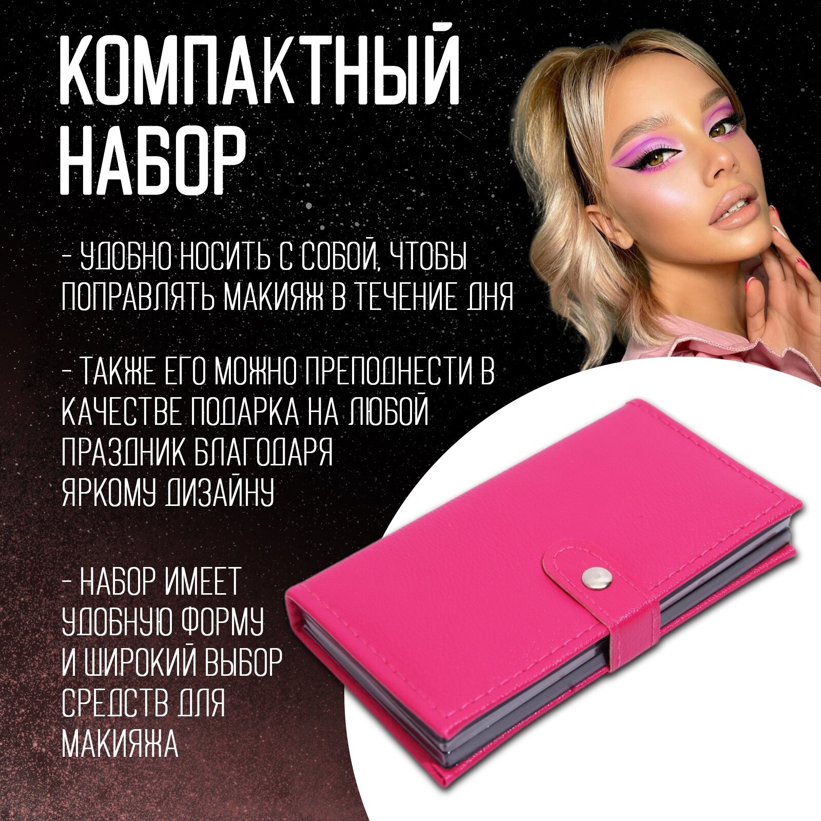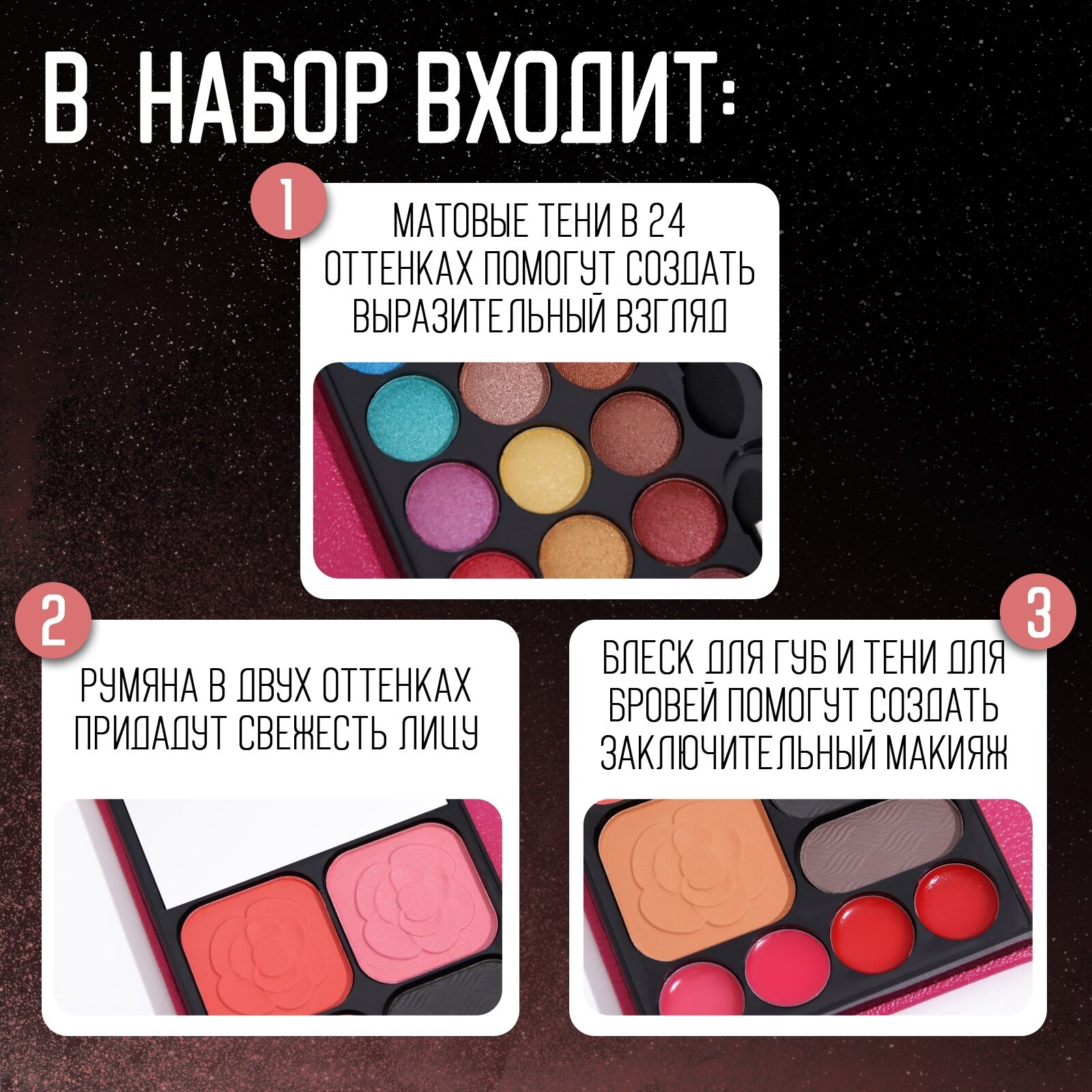 | В наборе | 24 оттенка теней для век, 4 оттенка блеска для губ, 3 оттенка румян, 2 оттенка теней для бровей, кисть, аппликатор, зеркало |
