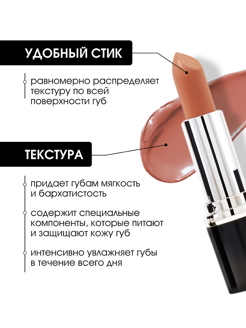 | Дополнительная информация | Матовое покрытие, насыщенный стойкий цвет. Легко наносится, придает губам мягкость и бархатистость, сияющий блеск и ощущение комфорта. Увлажнение губ в течение всего дня. |