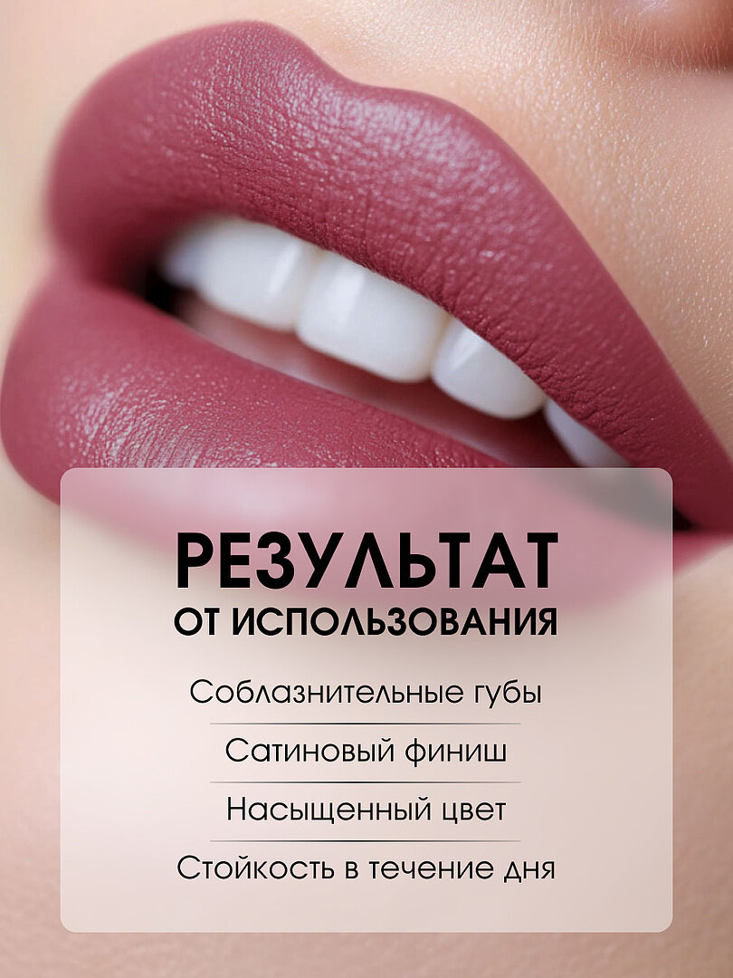 | Дополнительная информация | Матовое покрытие, насыщенный стойкий цвет. Легко наносится, придает губам мягкость и бархатистость, сияющий блеск и ощущение комфорта. Увлажнение губ в течение всего дня. |