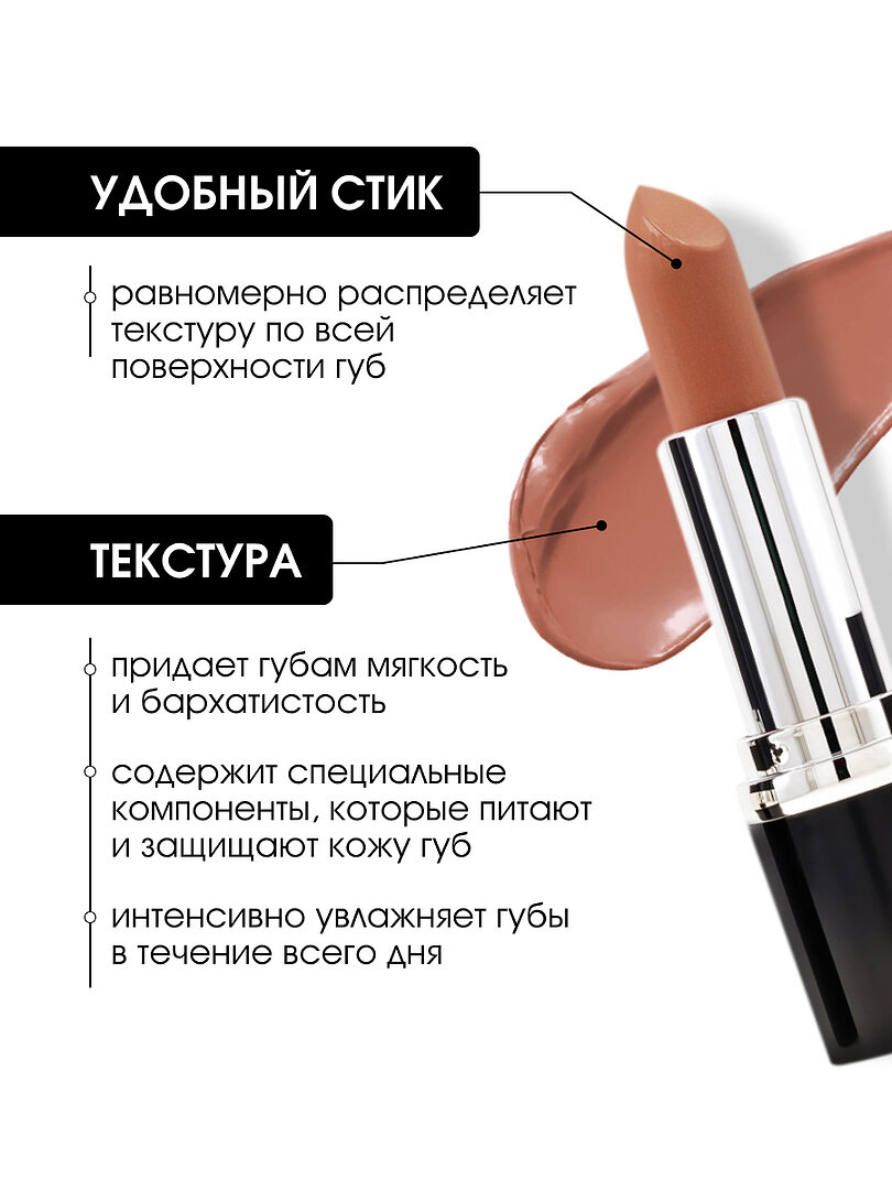 | Дополнительная информация | Матовое покрытие, насыщенный стойкий цвет. Легко наносится, придает губам мягкость и бархатистость, сияющий блеск и ощущение комфорта. Увлажнение губ в течение всего дня. |