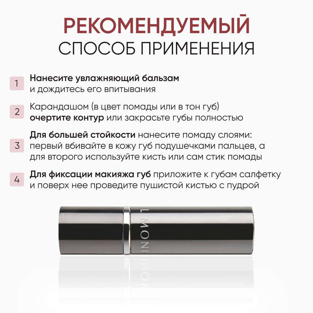 | Способ применения | Начните нанесение от центра верхней губы по дуге купидона, затем двигайтесь по направлению к уголкам и заполните центр губ. Для более четкого точного контура и интенсивного цвета используйте карандаш для губ. |