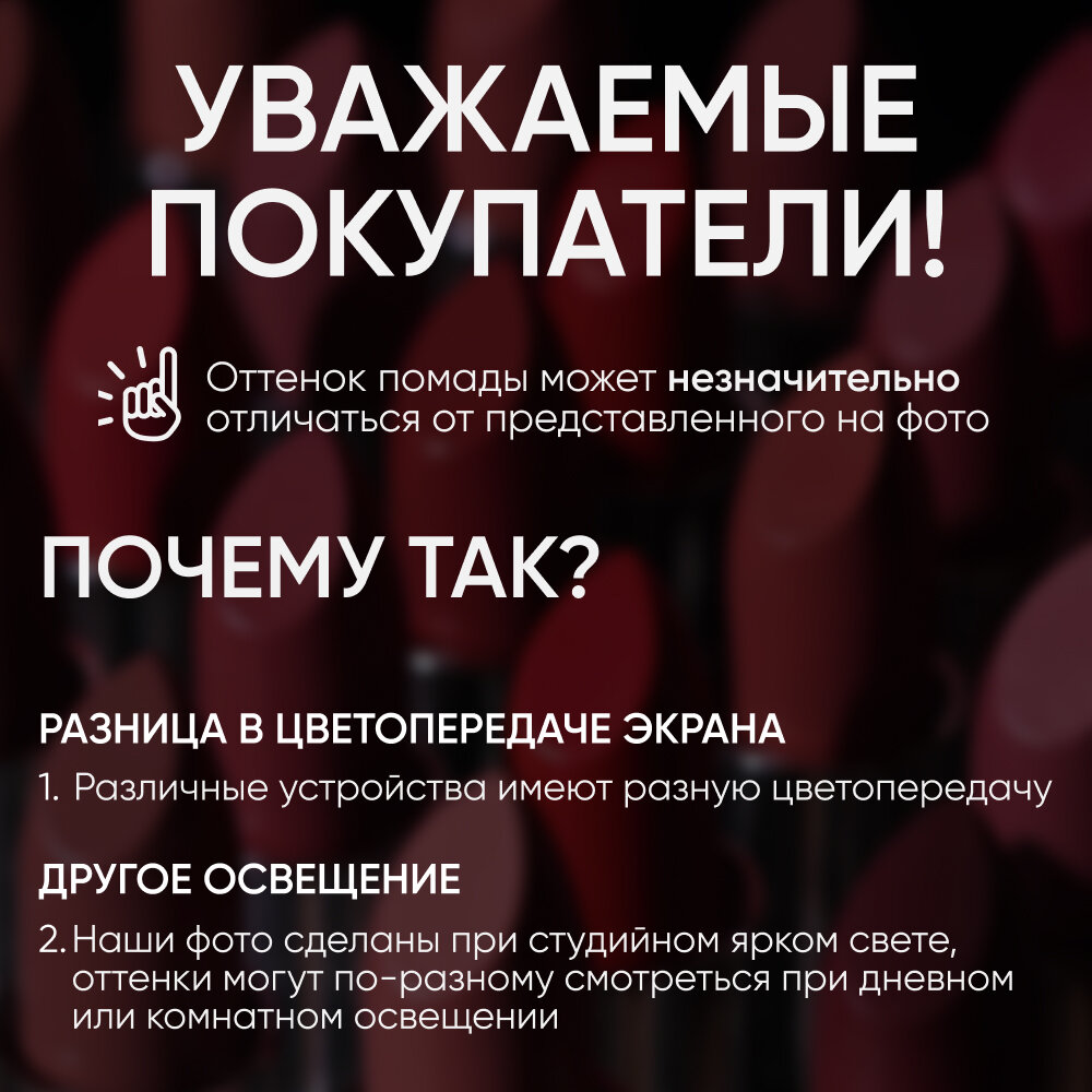 | Способ применения | Начните нанесение от центра верхней губы по дуге купидона, затем двигайтесь по направлению к уголкам и заполните центр губ. Для более четкого точного контура и интенсивного цвета используйте карандаш для губ. |