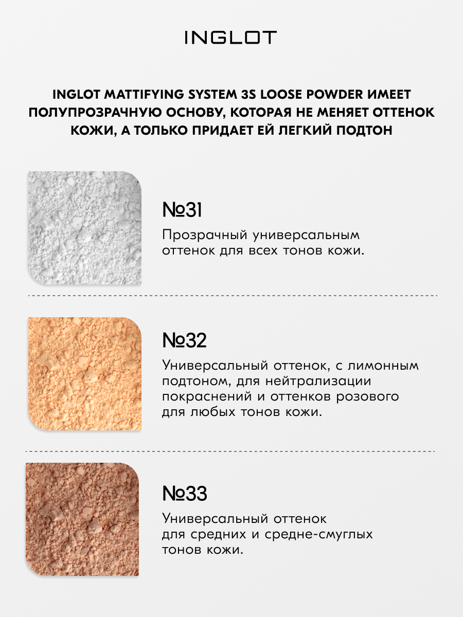 СохранитьРассыпчатая пудра INGLOT матирующая прозрачная Mattifying System 3S Loose Powder №32 интересное: