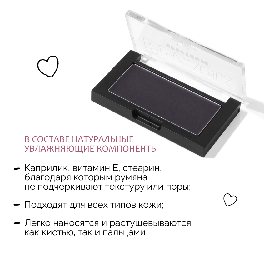 | Способ применения | нанесите небольшое количество румян на яблочки щек при помощи кисти. Лёгко растушуйте |