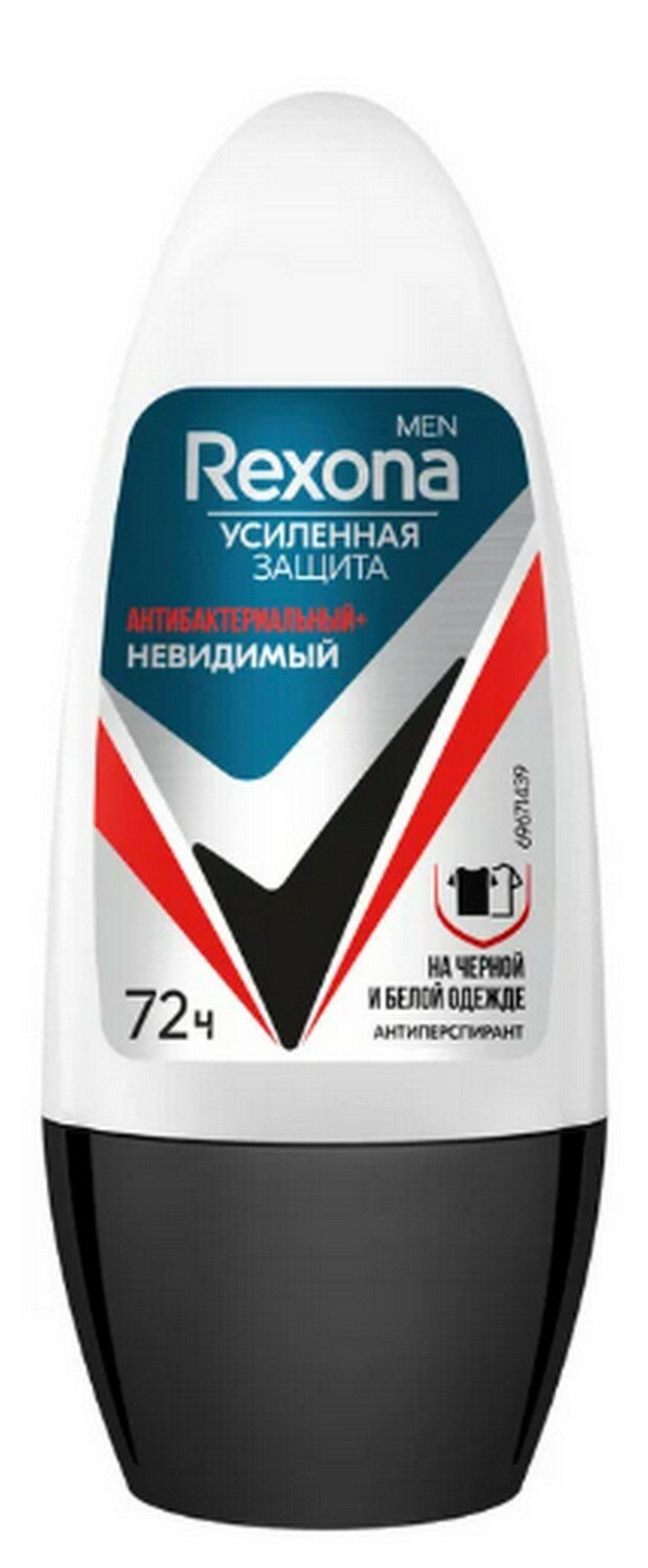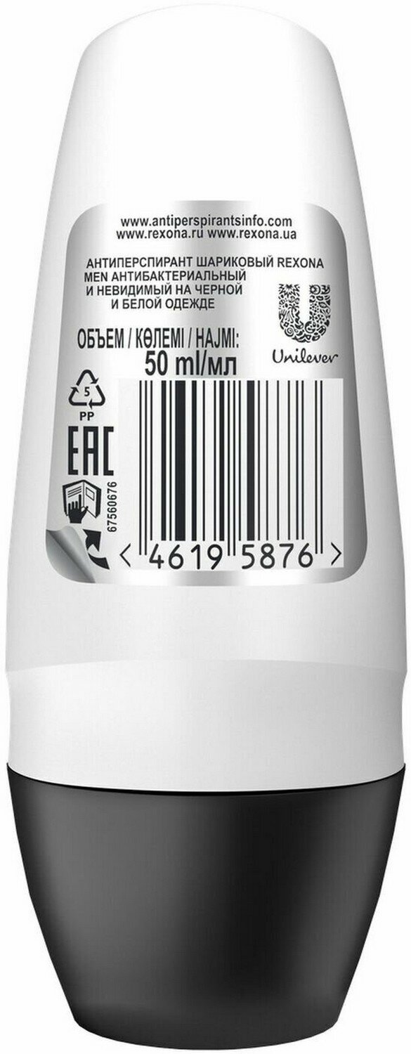 Дезодорант мужской шариковый антиперспирант Рексона Антибактериальный и Невидимый на черной и белой одежде, 50 мл,