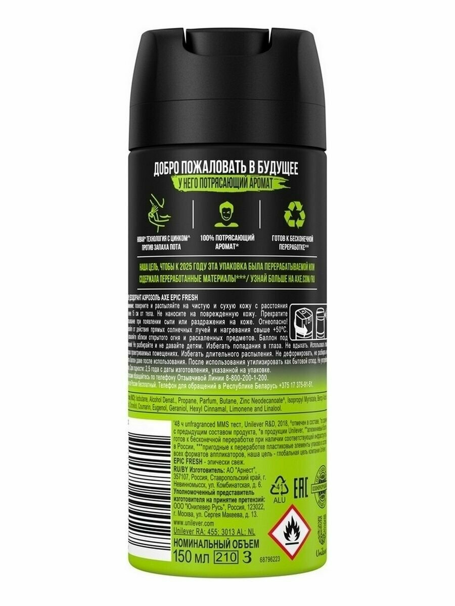 | Дополнительная информация | способ применения: распыляйте на сухую и чистую кожу с расстояния не менее 15 см от тела; не наносите на поврежденную кожу; прекратите использование при появлении сыпи или раздражения на коже |