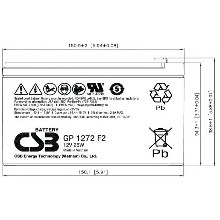 Аккумулятор для ИБП CSB GP-1272 12V 7.2Ah клеммы F2