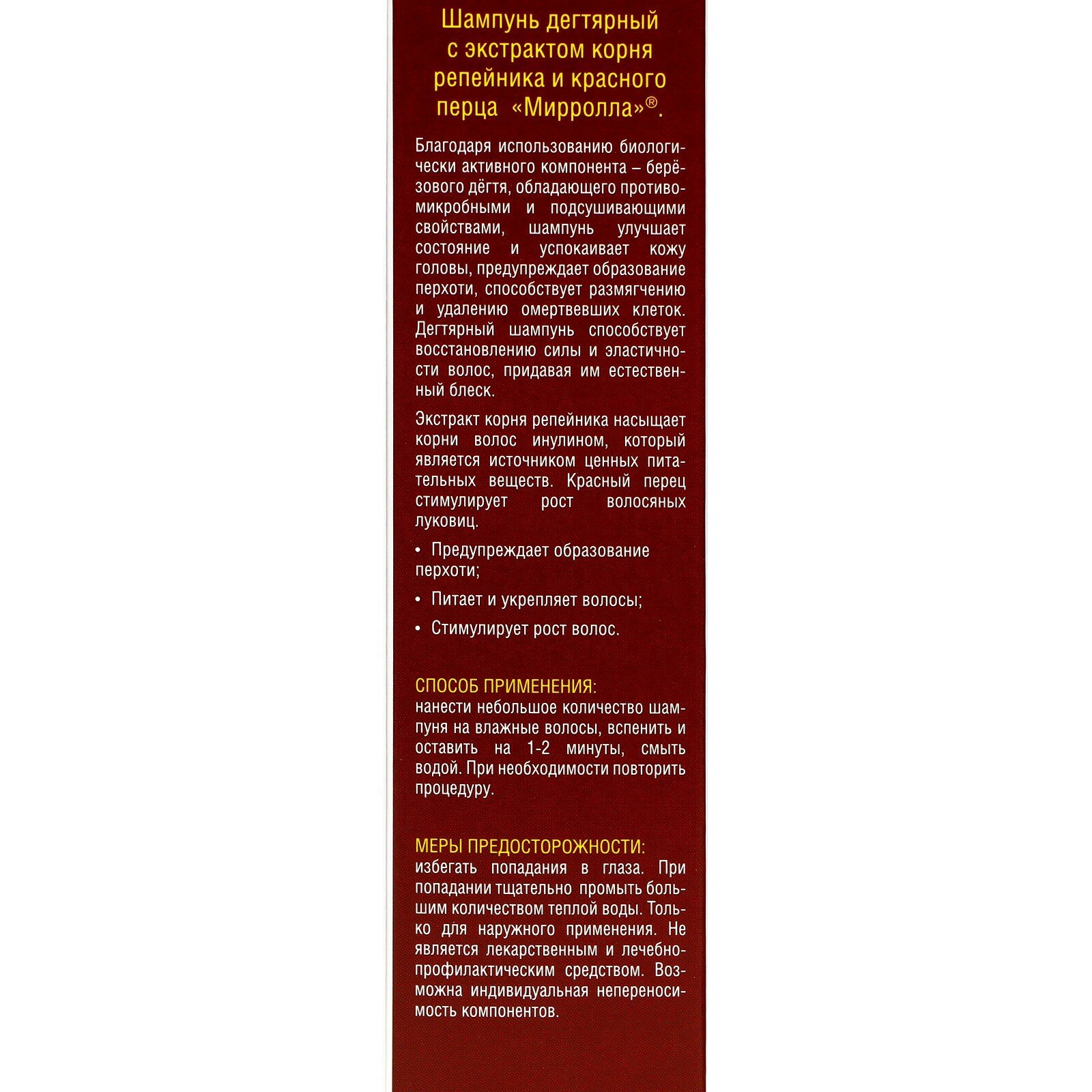 СохранитьШампунь Mirrolla дегтярный "Красный перец и экстракт репейного корня",150 мл 3099557 интересное: