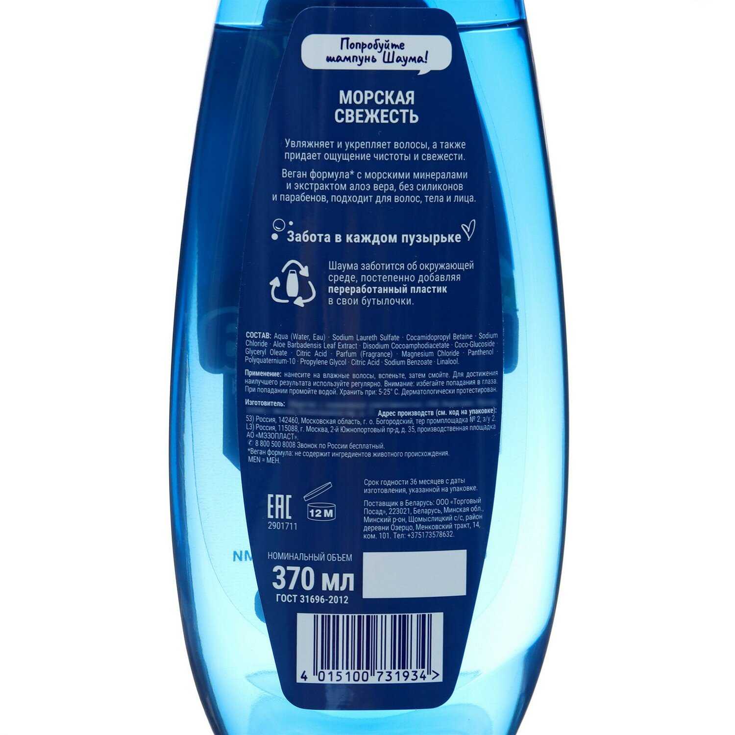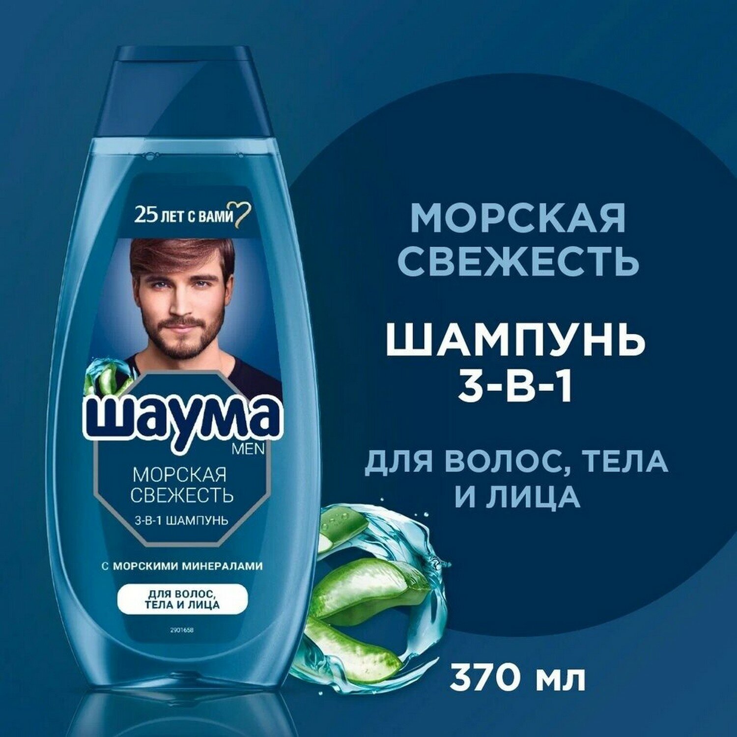 Шаума Men Шампунь для волос, тела и лица мужской Морская Свежесть 3-в-1, 370 мл