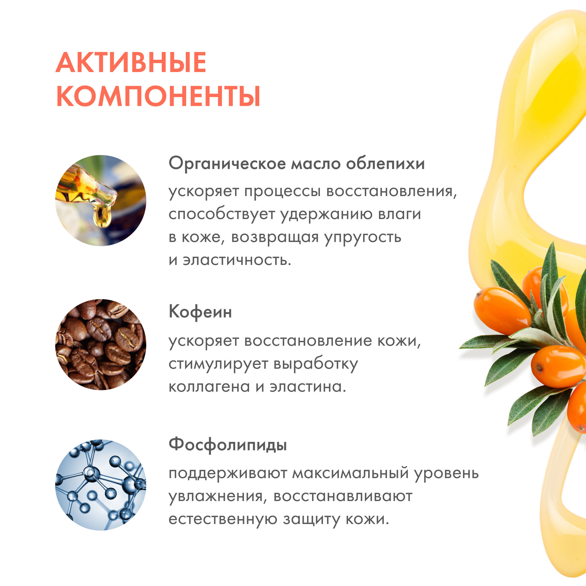 | Масла и экстракты | комплекс экстрактов / масло облепихи / экстракт женьшеня / экстракт календулы |