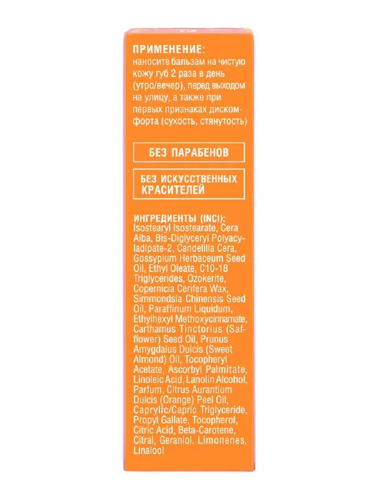 | Состав | Isostearyl Isostearate, Cera Alba, Bis-Diglyceryl Polyacyladipate-2, Candelilla Cera, Gossypium Herbaceum Seed Oil, Ethyl Oleate, C10-18 Triglycerides, Ozokerite, Copernicia Cerifera Wax, Simmondsia Chinensis Seed Oil, Paraffinum Liquidum, Ethylhexyl Methoxycinnamate, Carthamus Tinctorius Seed Oil, Prunus Amygdalus Dulcis Oil, Tocopheryl Acetate, , Ascorbyl Palmitate, Linoleic Acid, Lanolin Alcohol, Parfum, Citrus Aurantium Dulcis Peel Oil, Caprylic/Capric Triglyceride, Propyl Gallate, Tocopherol, Citric Acid, Beta-Carotene, Citral, Geraniol, Limonenes, Linalool |