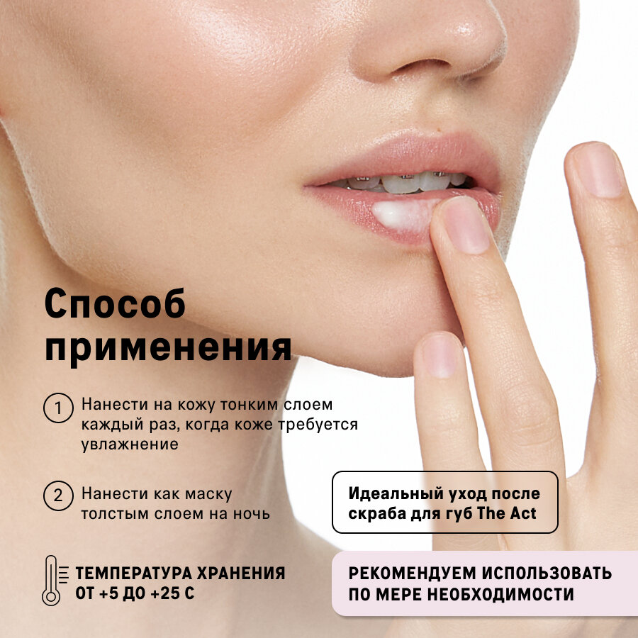 | Способ применения | Наносите на губы по мере необходимости или используйте в качестве маски, оставляя на всю ночь. |