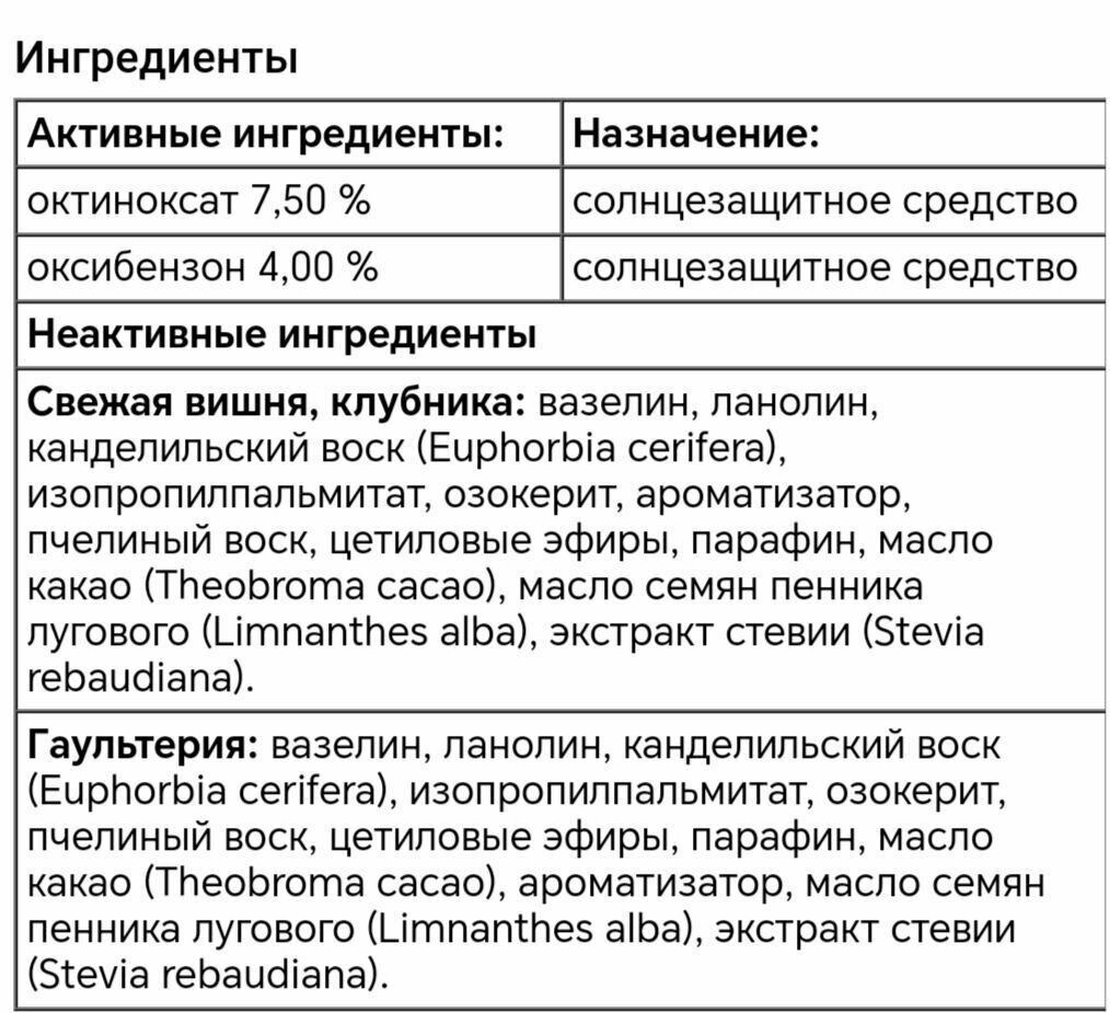 | Состав | Активные ингредиенты: Белый вазелин 41,25%, Неактивные Ингредиенты: ланолин, масло семян какао теобромы, воск молочая цериферного, пчелиный воск, цетиловые эфиры, озокерит, парафин, масло семян лимнантеса альба, камфора, ментол, салициловая кислота, фенол, ароматизатор, ванилин |
