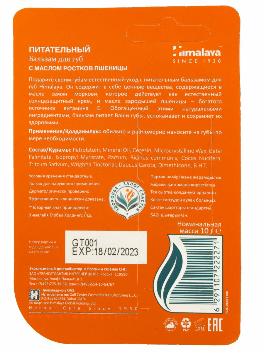 Himalaya Since 1930 Бальзам для губ питательный c маслом ростков пшеницы и семян моркови увлажняющий, 10 г