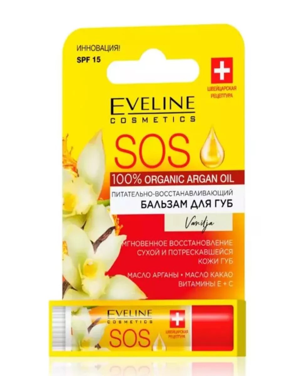 Бальзам для губ EVELINE SOS ARGAN OIL Ваниль SPF-15 (питательно-восстанавливающий) 4,5 г
