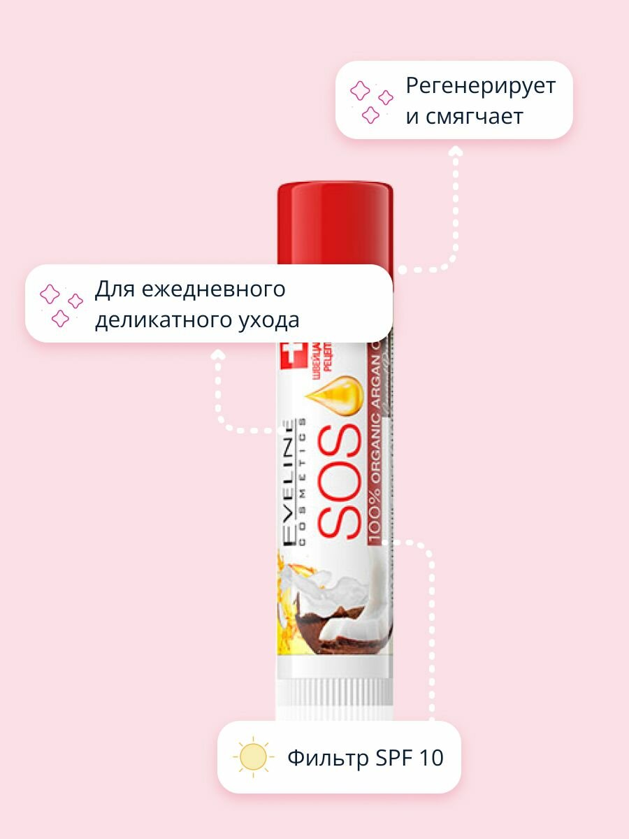 Купить EVELINE Бальзам для губ SOS ARGAN OIL COCONUT DREAM восстанавливающий, 4,5 г SPF10