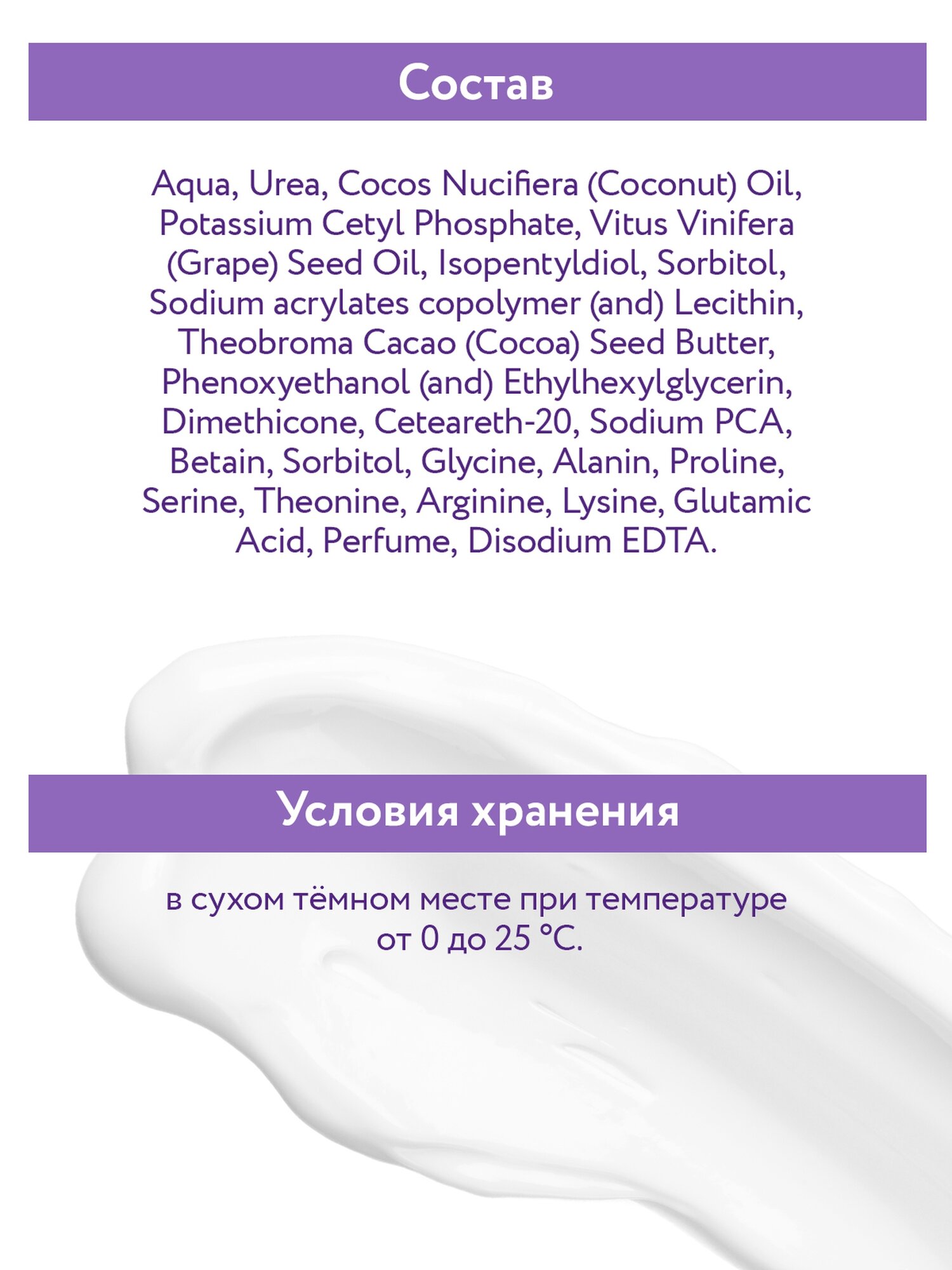 | Состав | Aqua, Urea, Cocos Nucifiera (Coconut) Oil, Potassium Cetyl Phosphate, Vitus Vinifera (Grape) Seed Oil, Isopentyldiol, Sorbitol, Sodium acrylates copolymer (and) Lecithin, Theobroma Cacao (Cocoa) Seed Butter, Phenoxyethanol (and) Ethylhexylglycerin, Dimethicone, Ceteareth-20, Sodium PCA, Betain, Sorbitol, Glycine, Alanin, Proline, Serine, Theonine, Arginine, Lysine, Glutamic Acid, Perfume, Disodium EDTA |