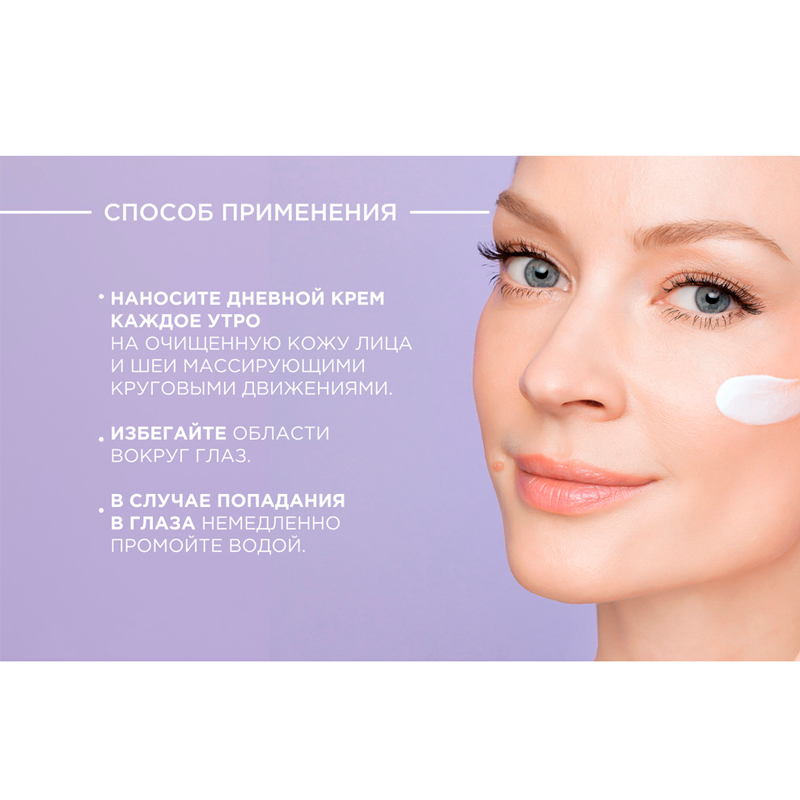 | Способ применения | наносите крем круговыми движениями на тщательно очищенную кожу, избегайте области вокруг глаз, в случае попадания в глаза немедленно промыть водой |