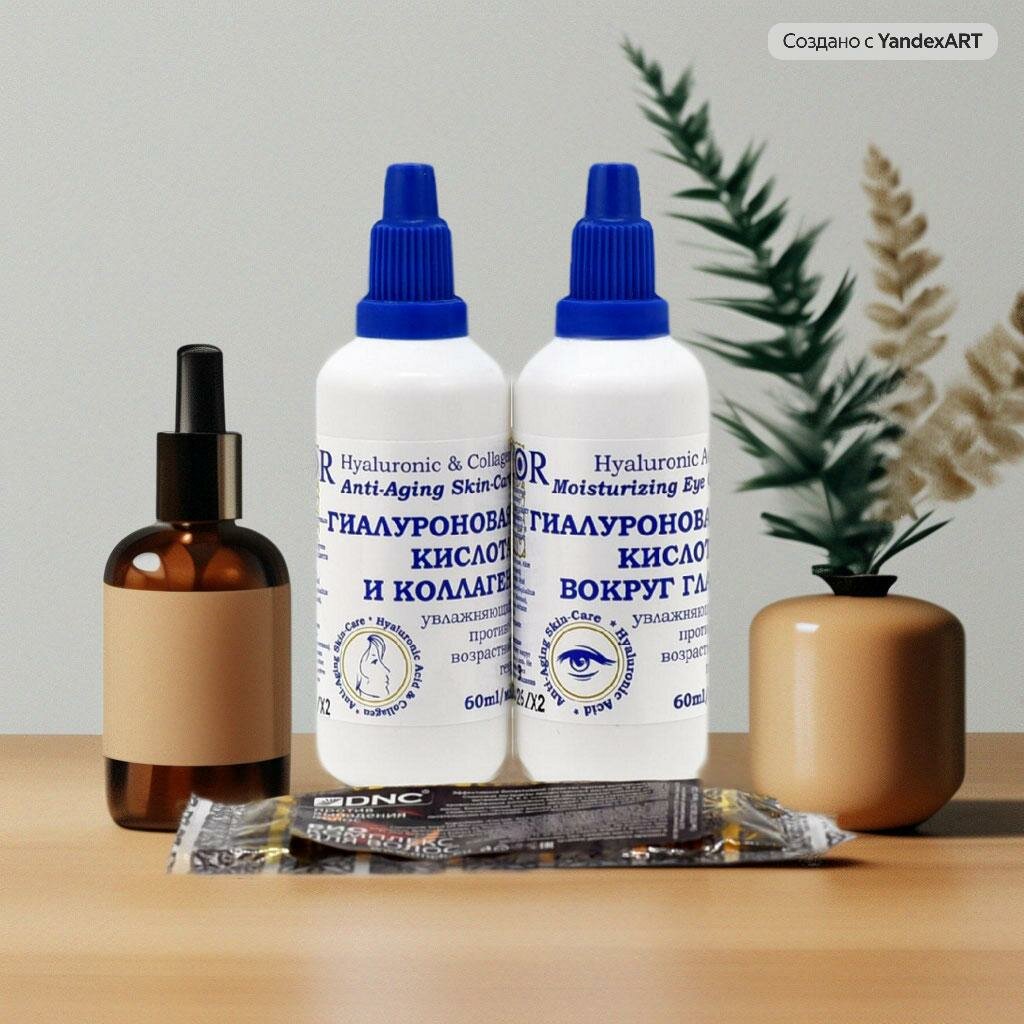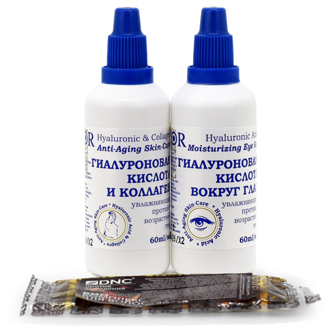 Набор DNC: Гиалуроновая кислота и Коллаген 60 мл, Гиалуроновая кислота для области вокруг глаз 60 мл + Презент интересное: