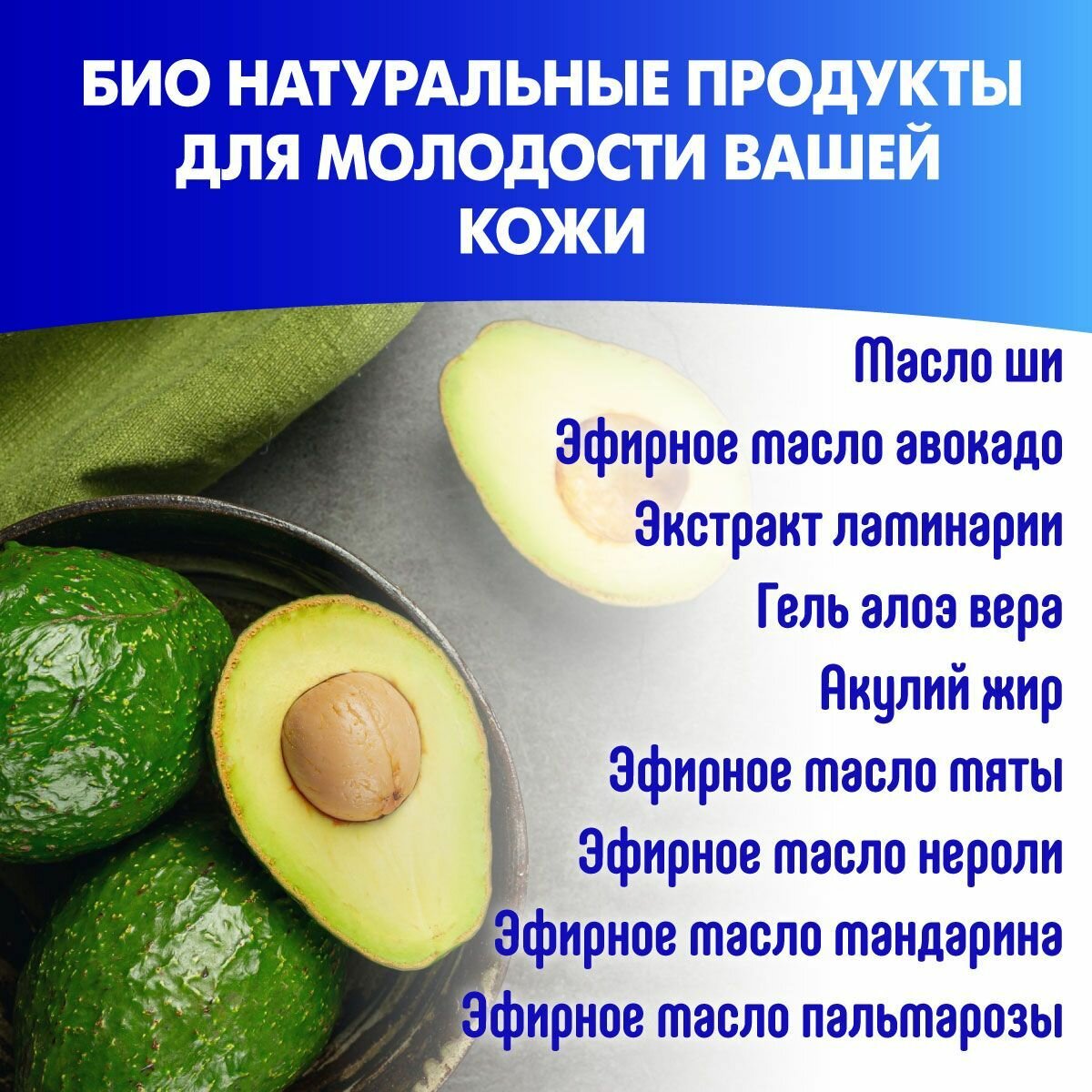 | Состав | масло ши , масло авокадо , коллаген , эластин , экстракт ламинарии , гель алоэ вера , аллантоин , витамин е , акулий жир , масло мяты , масло нероли , масло мандарина , масло пальмарозы |