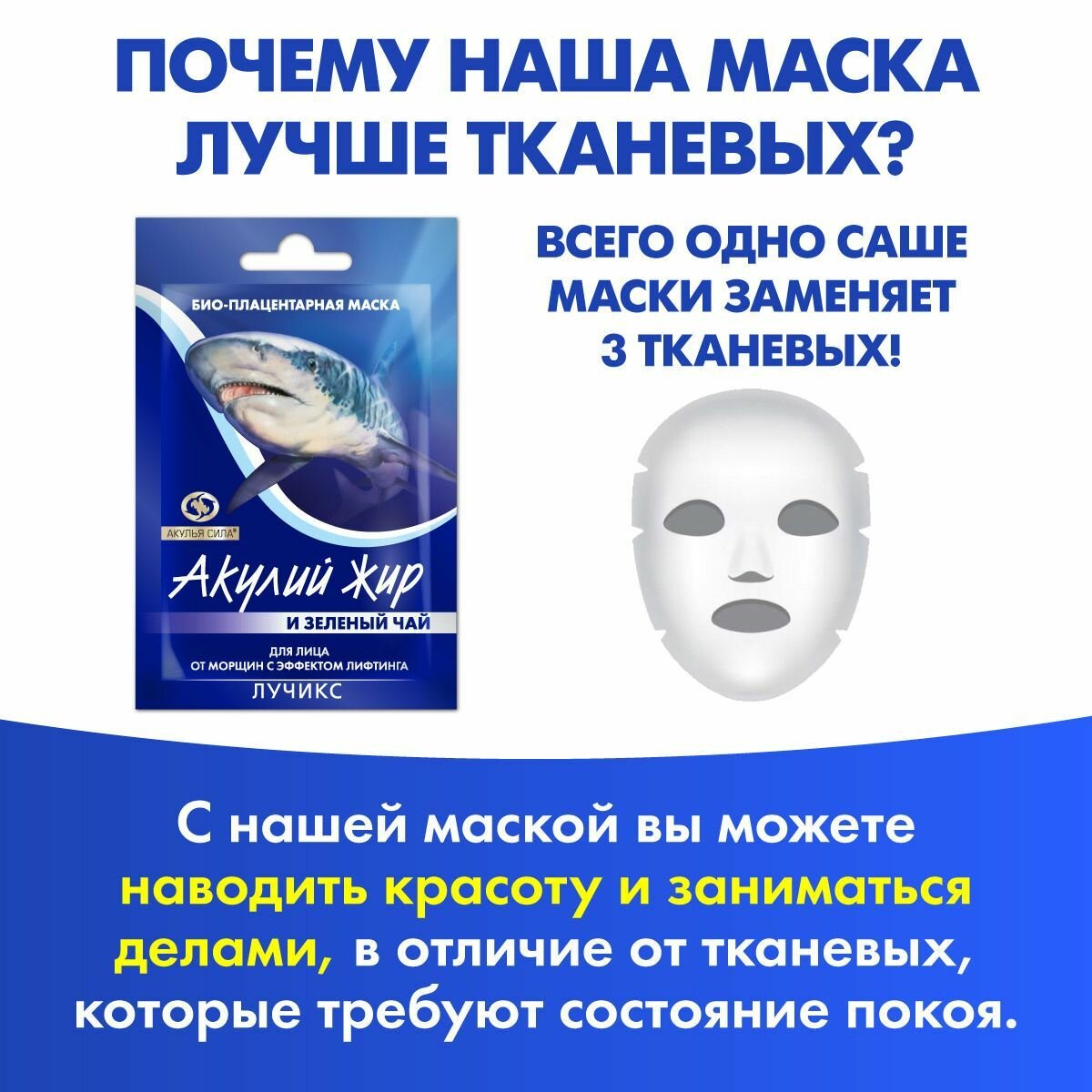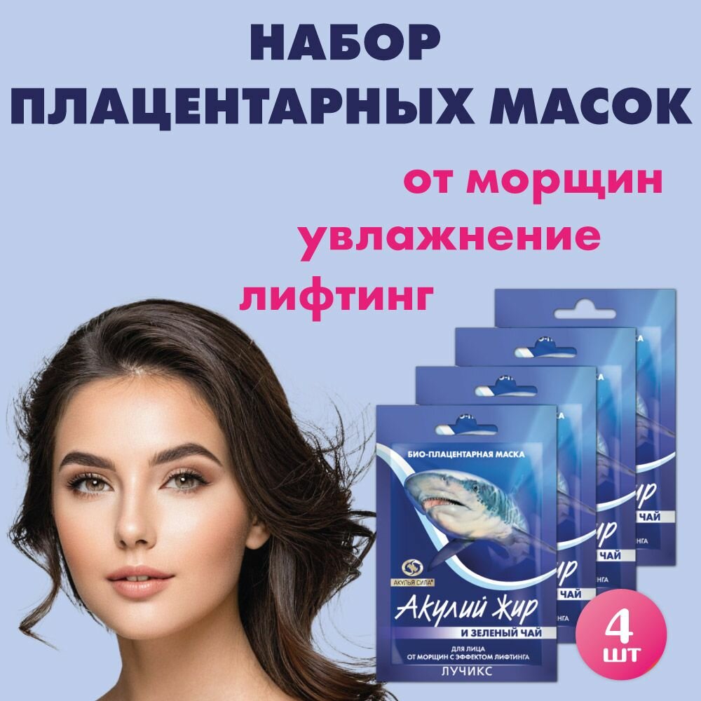 Акулья сила. Гиалуроновая маска от морщин с эффектом лифтинга, омоложение, увлажнение. Акулий жир и зеленый чай 4 шт. по 10 мл / лучикс интересное: