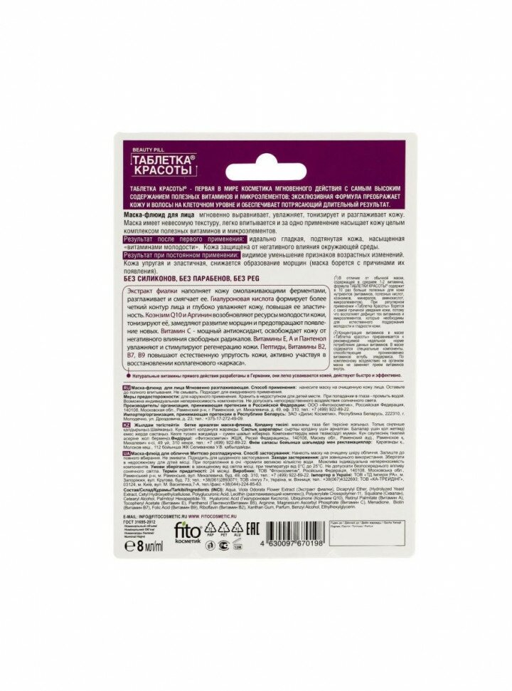Фитокосметик Таблетка Красоты Маска-флюид для лица Мгновенно разглаживающая, капсула 8 мл