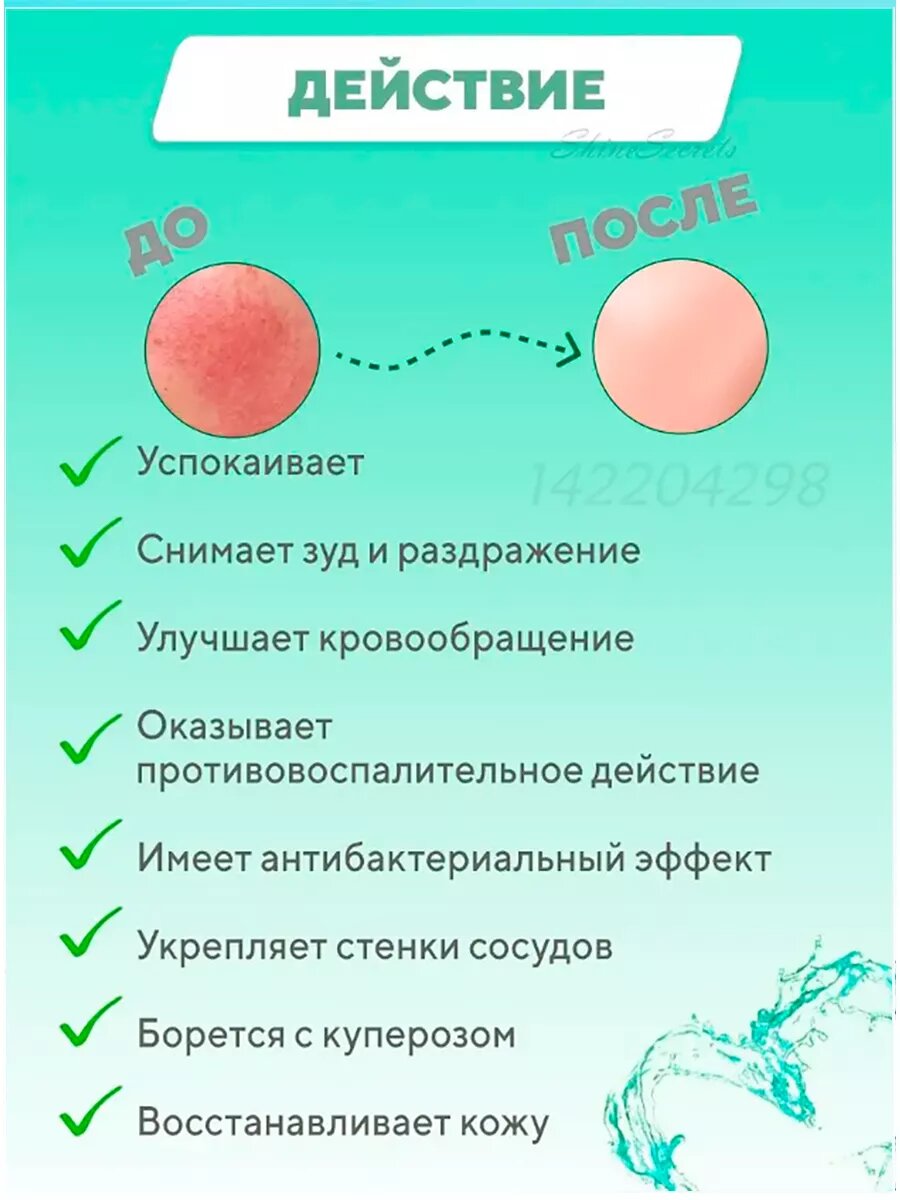 | Эффект | восстановление / выравнивание микрорельефа / матирование / от купероза / очищение / питание / повышение упругости / подсушивание воспалений / против акне / расслабление / себорегуляция / сияние кожи / смягчение / снятие воспалений / снятие отеков / тонизирование / увлажнение / улучшение цвета |