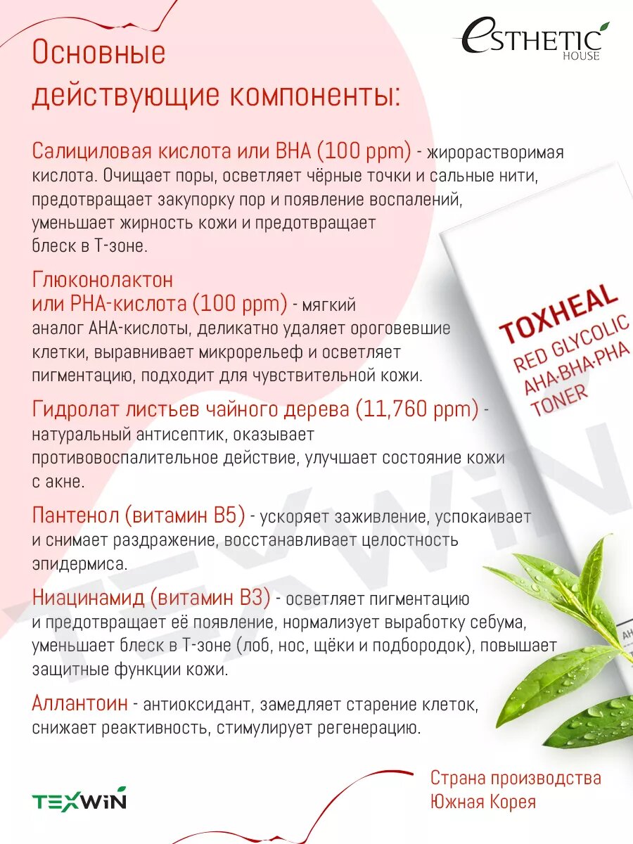 Esthetic House Toxheal Red Glycolic AHA-BHA-PHA Toner Тоник-пилинг с гликолевой кислотой 180 мл