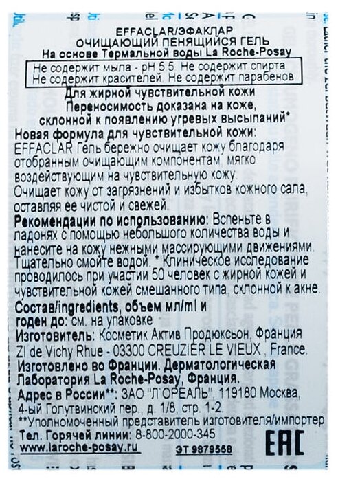 | Дополнительная информация | EFFACLAR Гель эффективно очищает кожу от загрязнений и избытков кожного сала, оставляя ее чистой и свежей. |