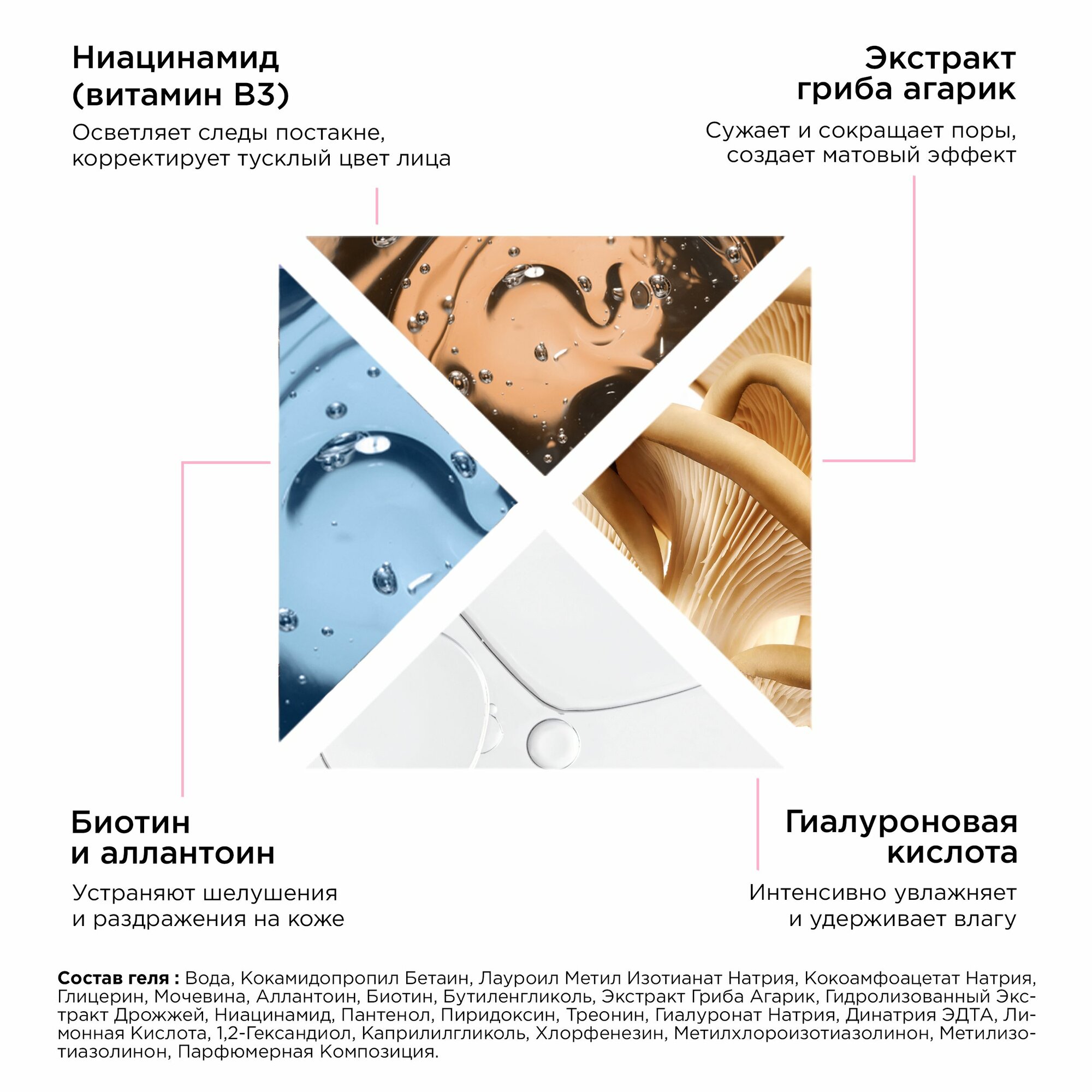 | Состав | Водный комплекс экстрактов геля алоэ вера, зеленого чая, ромашки, коко-сульфат натрия, кокамидопропилбетаин, глицерин, гликолевая кислота, кокоамфоацетат натрия, гидроксид натрия, гликольдистеарат, увлажняющий комплекс ELFAMOIST, растительные экстракты готу колы, лакричника, розмарина, дегидроацетовая кислота, бензиловый спирт, ПЭГ-7 глицерил кокоат, аллантоин, парфюмерная композиция. |