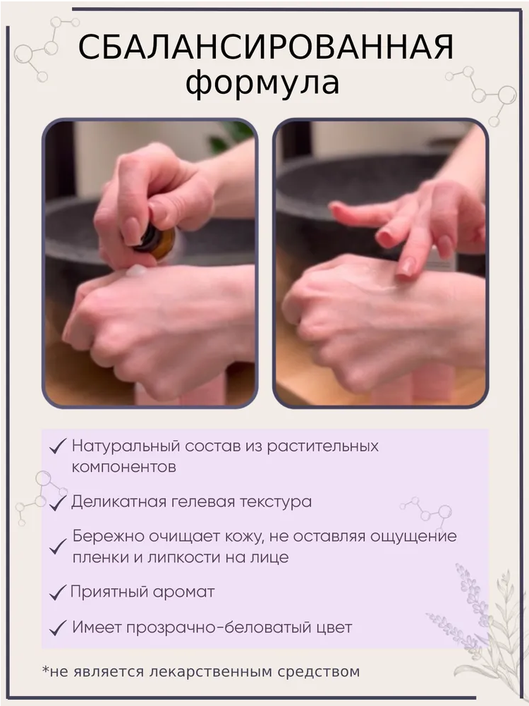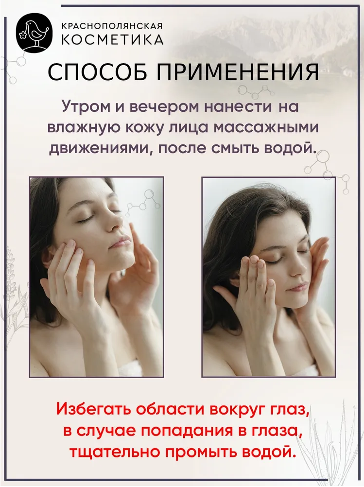 | Способ применения | Утром и вечером наносить на влажную кожу лица массажными движениями, после смыть водой. Избегать области вокруг глаз, в случае попадания в глаза, тщательно промыть водой. |