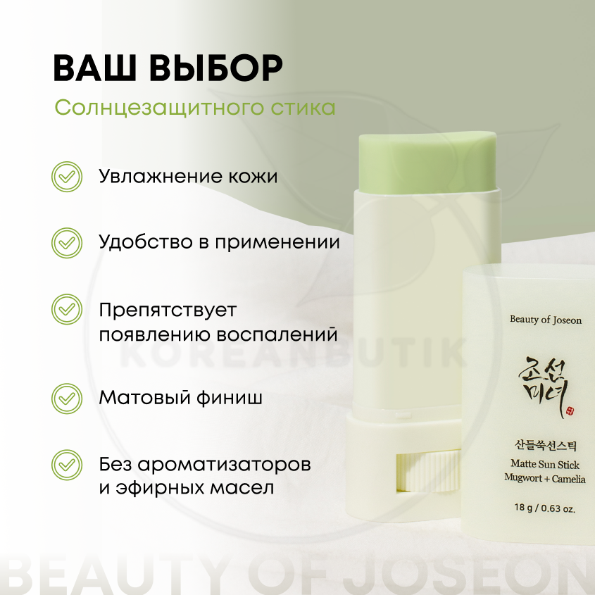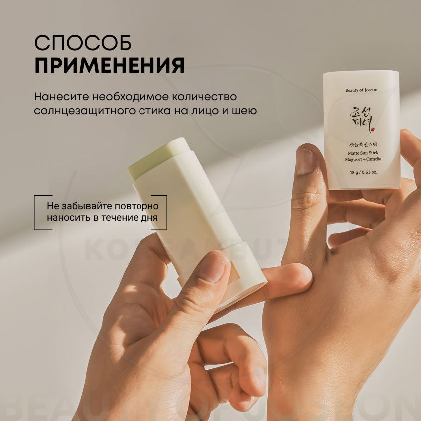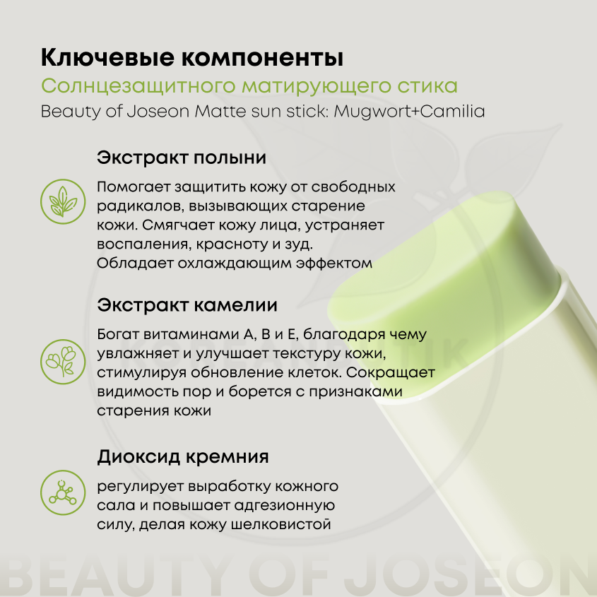Себорегулирующий солнцезащитный стик с экстрактом полыни и зелёного чая Beauty of Joseon Matte Sun Stick Mugwort + Camelia SPF 50+ PA++++ интересное: