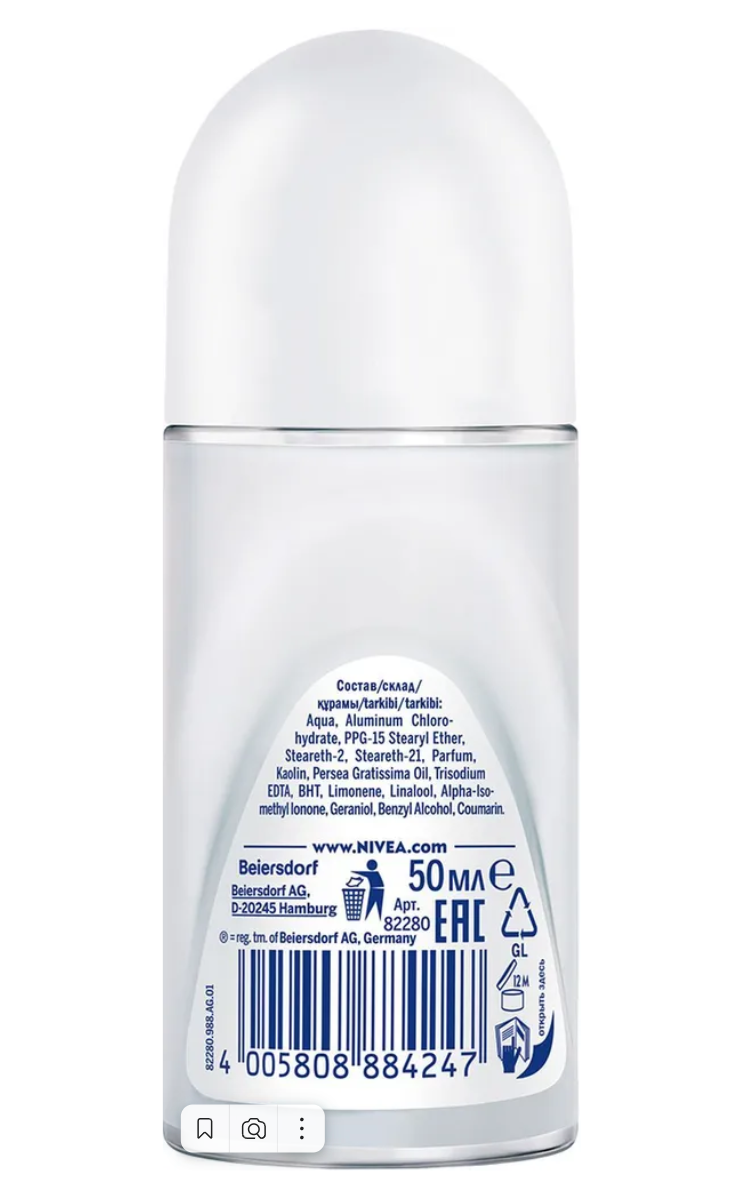| Полный состав | aqua, aluminum chlorohydrate, ppg-15 stearyl ether, steareth-2, steareth-21, parfum, kaolin, persea gratissima oil, trisodium edta, bht, limonene, linalool, geraniol, benzyl alcohol, coumarin |