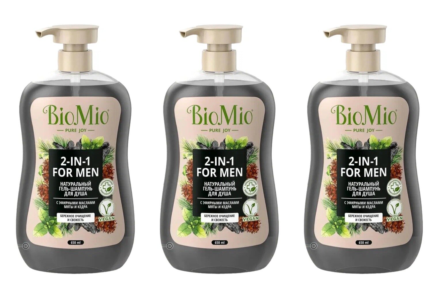 Набор из 3 штук Гель-шампунь для душа BioMio с эфирными маслами мяты и кедра Натуральный 650мл