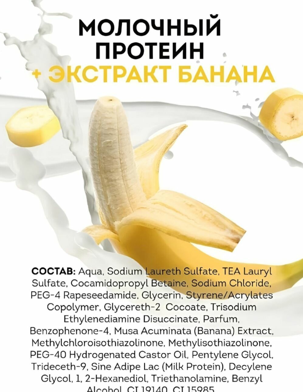 | Состав | Aqua, Sodium Laureth Sulfate, TEA Lauryl Sulfate, Cocamidopropyl Betaine, Sodium Chloride, PEG-4 Rapeseedamide, Glycerin, Styrene/Acrylates Copolymer, Glycereth-2 Cocoate, Trisodium Ethylenediamine Disuccinate, Parfum, Benzophenone-4, Musa Acuminata (Banana) Extract |