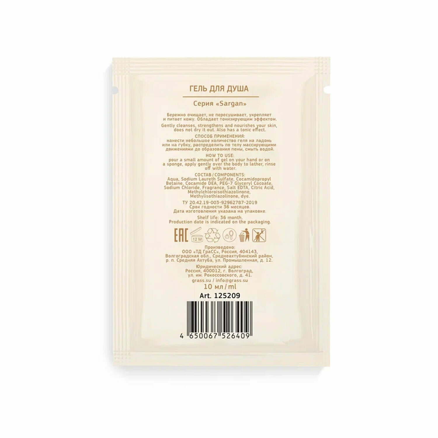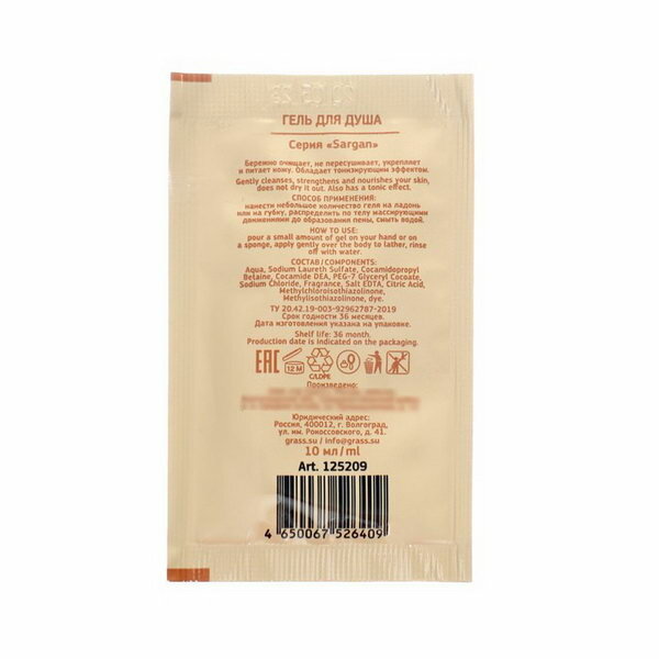 Гель для душа одноразовый 10 мл, комплект 500 шт., GRASS SARGAN, саше, флоупак, 125209